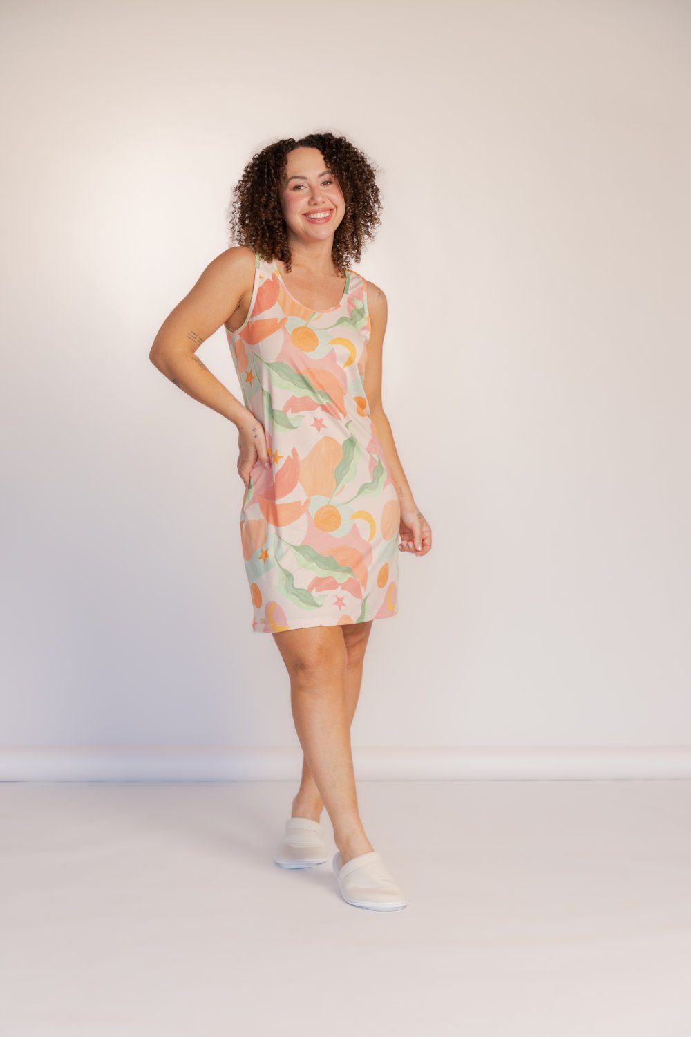 Colorida, leve e muito fresquinha, ela deixa o look de dormir alegre sem perder a delicadeza. A modelagem é reta e soltinha, com comprimento acima do joelho e alças largas, que dão mais conforto, não ficam caindo e não marcam o ombro. O tecido tem toque macio e levemente geladinho, ideal para noites quentes ou para ficar em casa com estilo. O caimento acompanha o corpo sem apertar, permitindo se movimentar, sentar ou deitar com total liberdade, sem transparência exagerada, e é ótima para montar kit presente.