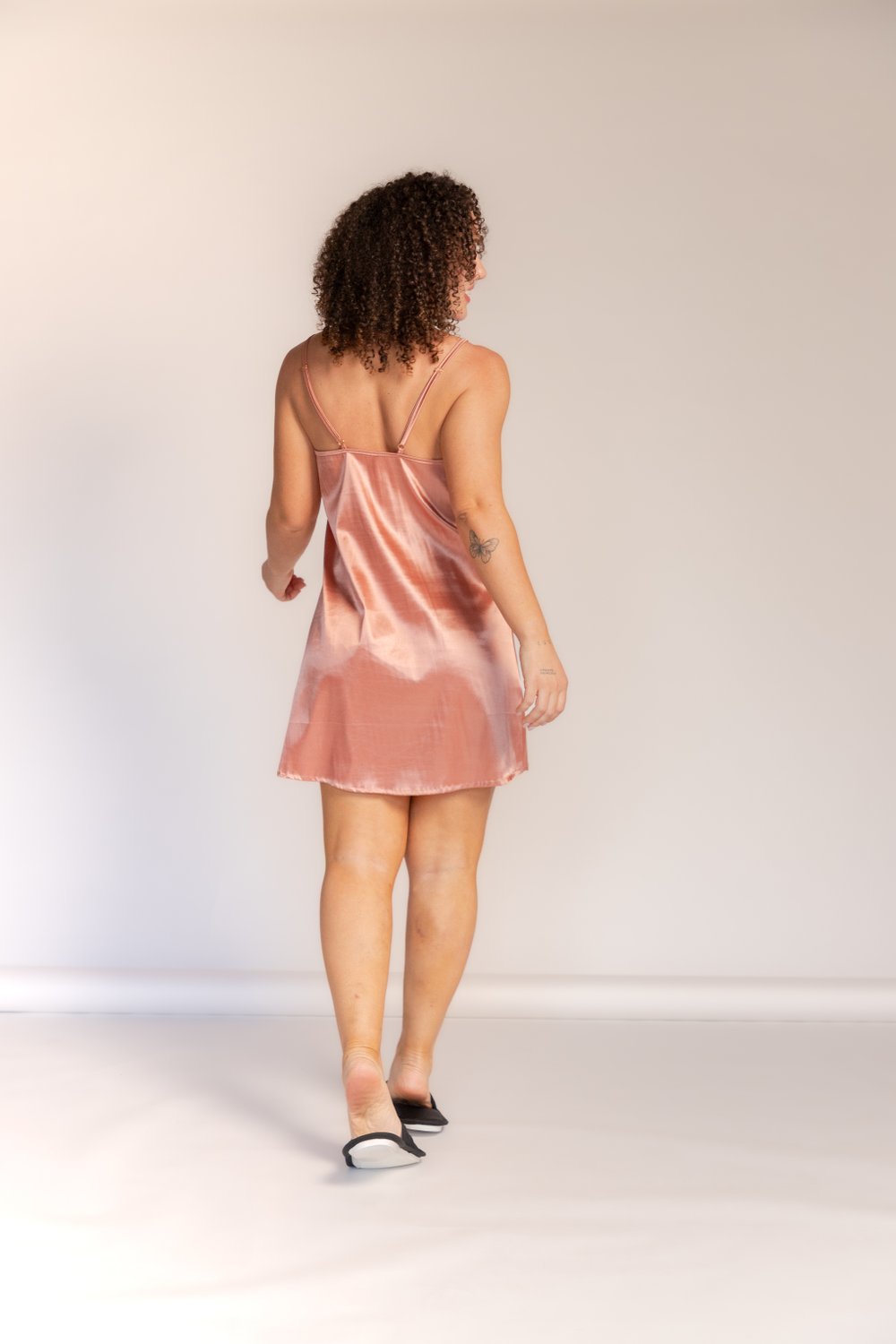 Delicada camisola de cetim rosé com brilho acetinado. Alças finas reguláveis, decote suave e costas livres. Modelagem reta levemente evasê, caimento soltinho que não aperta e não marca. Toque macio e geladinho para noites confortáveis ou para relaxar em casa. Acabamento limpo na barra. Elegante e versátil. Perfeita para presentear e compor com robe