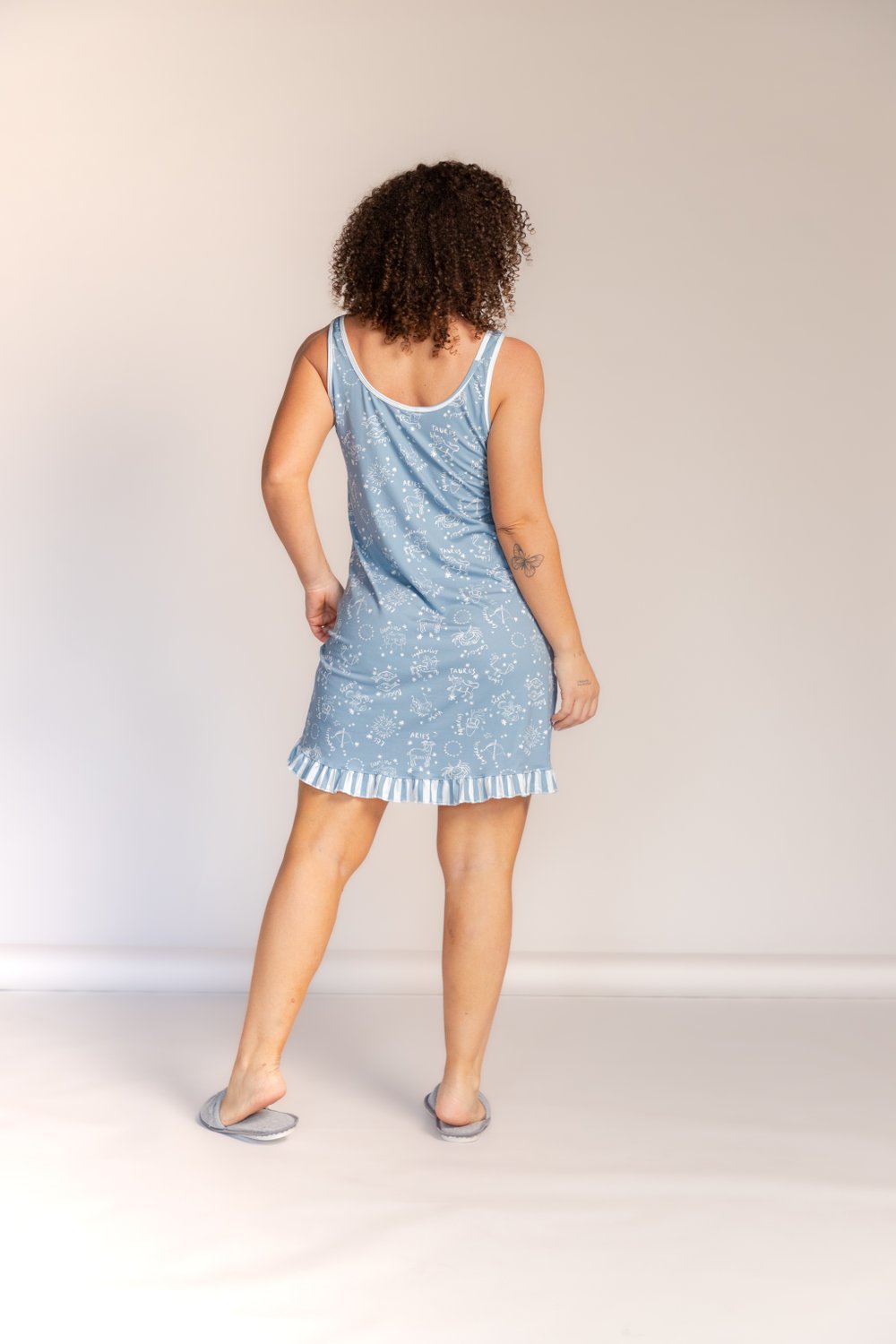 Camisola com estampa de signos com toque super macio, alça regata com viés, decote redondo, modelo reto, bainha de babados, vestindo muito bem, super confortável e linda. A combinação de poliéster com o Elastano garante durabilidade e praticidade no seu dia a dia.