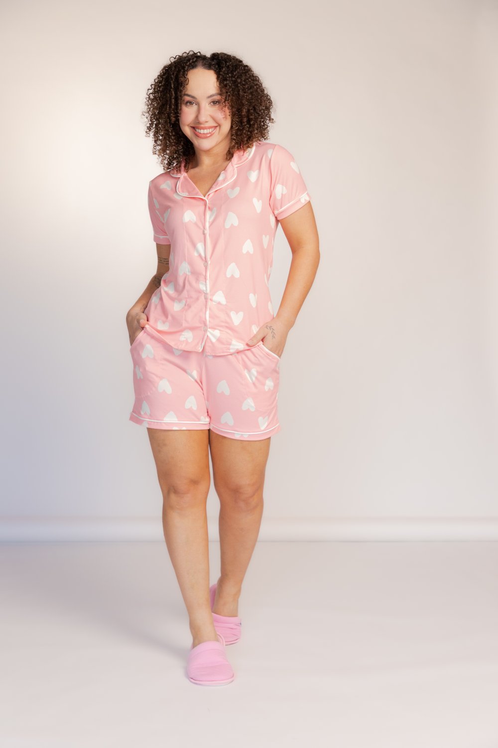 Pijama americano Dreams, blusa aberta com vivo e botões que facilitam a amamentação, etiqueta dourada como detalhe, corte reto, bermuda com vivo, cós e bolso funcional.