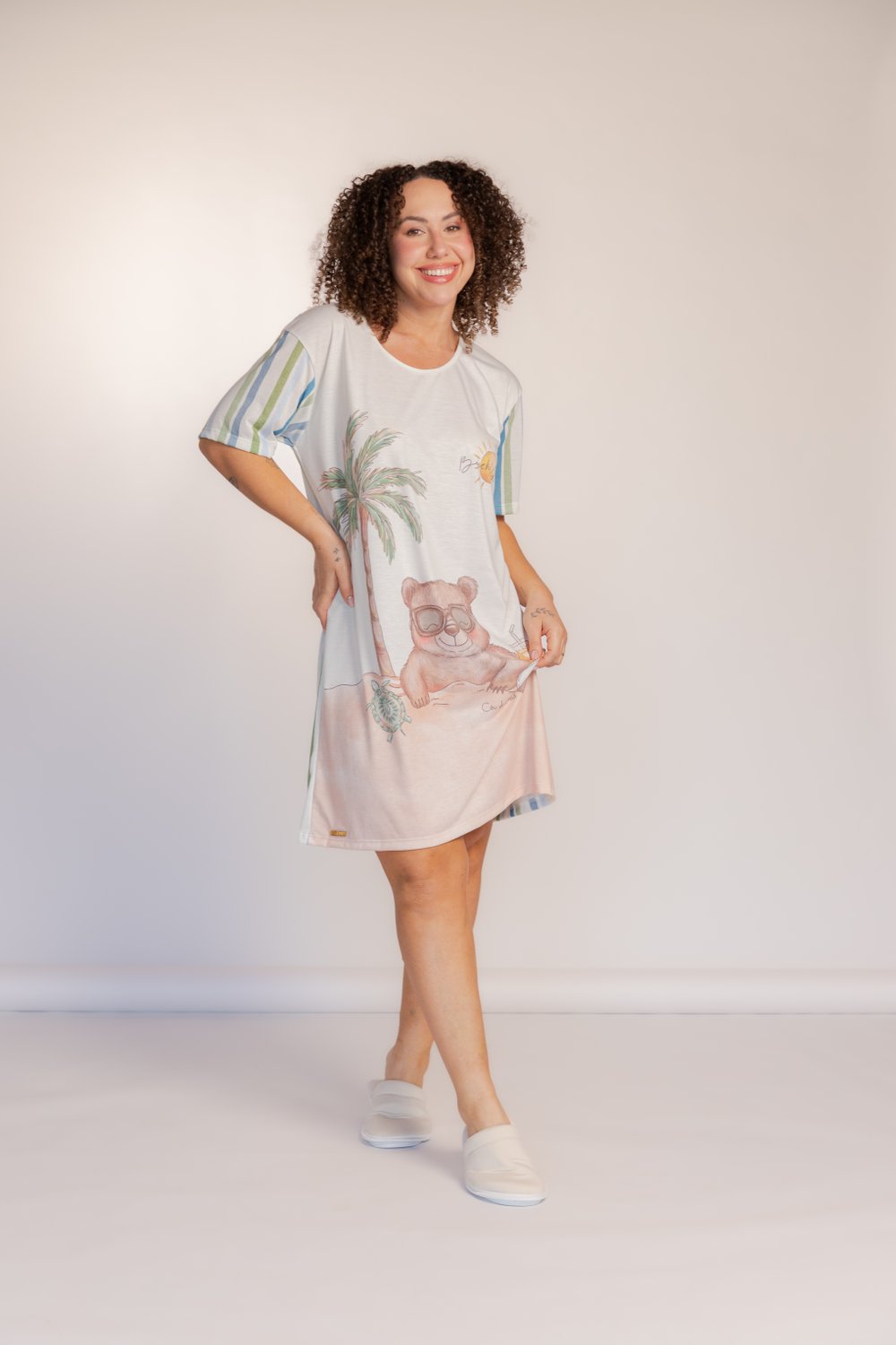 Camisola, leve e divertido, desenvolvido para oferecer conforto e frescor nas noites de primavera e verão. Com blusa estampada de urso estilizado e shorts listrado em tons suaves, traz modernidade e charme para os momentos de descanso e lazer em casa.