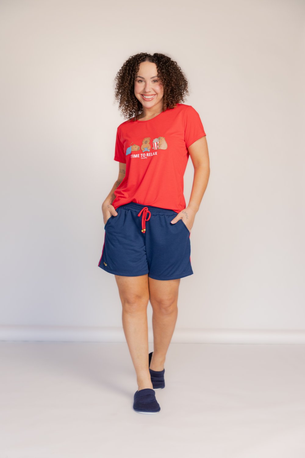 Pijama Manga Curta feminino com estampa de capivara com a Frase Time To Relax