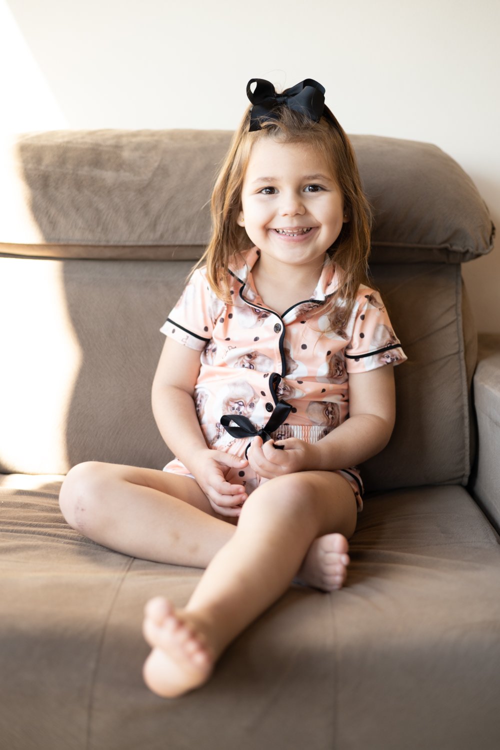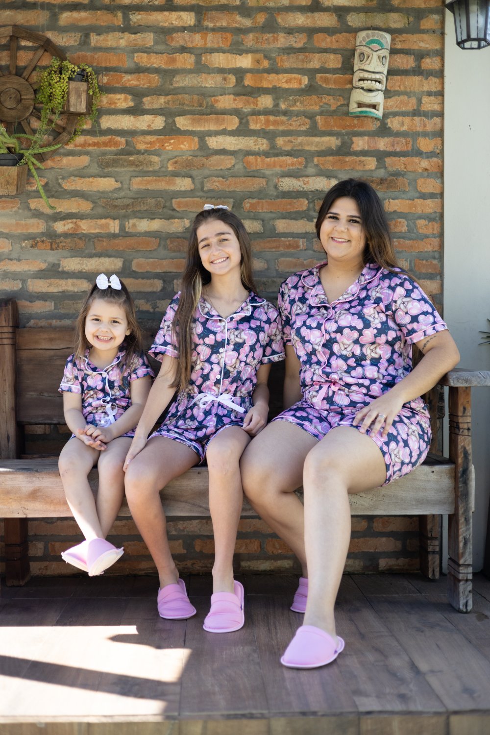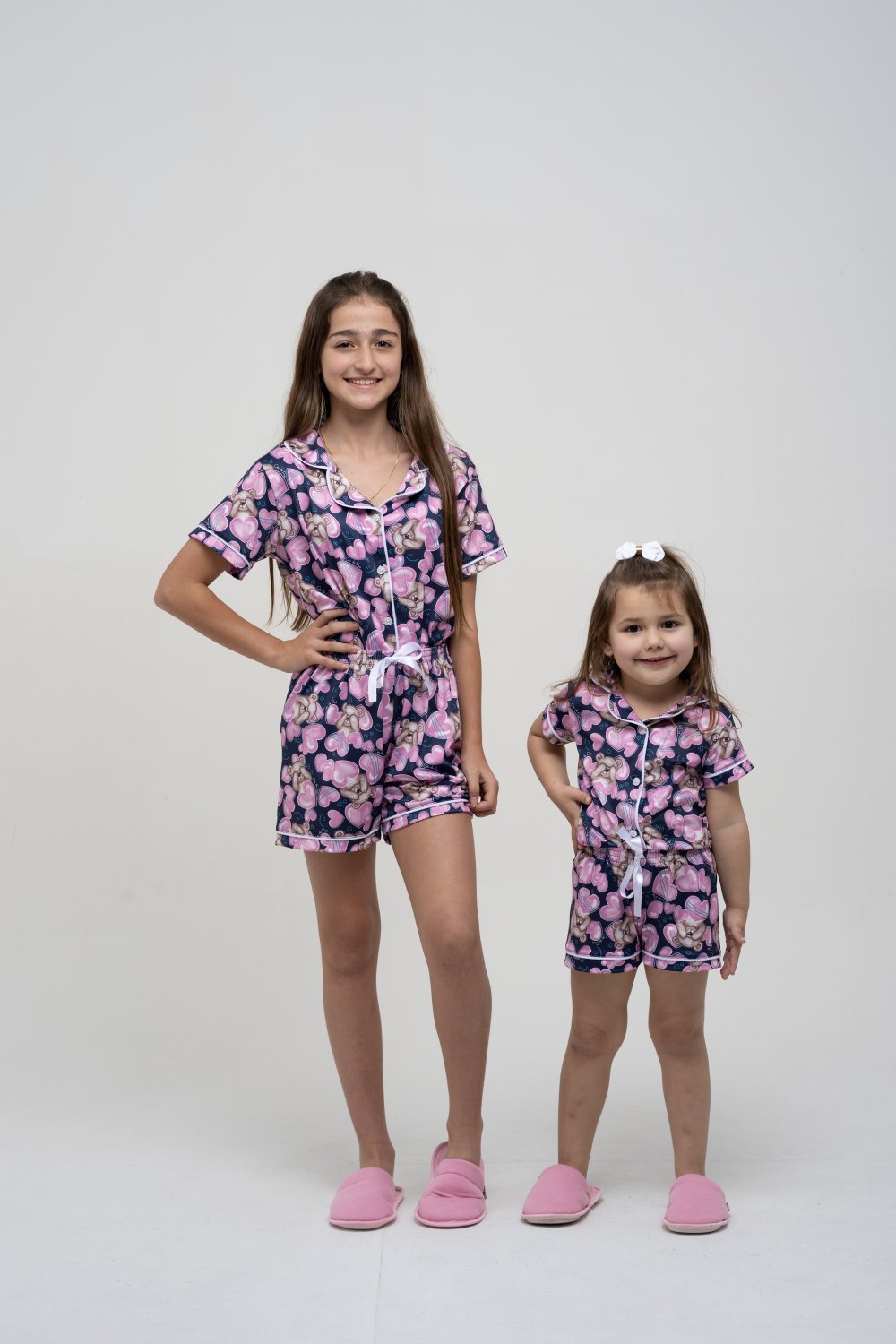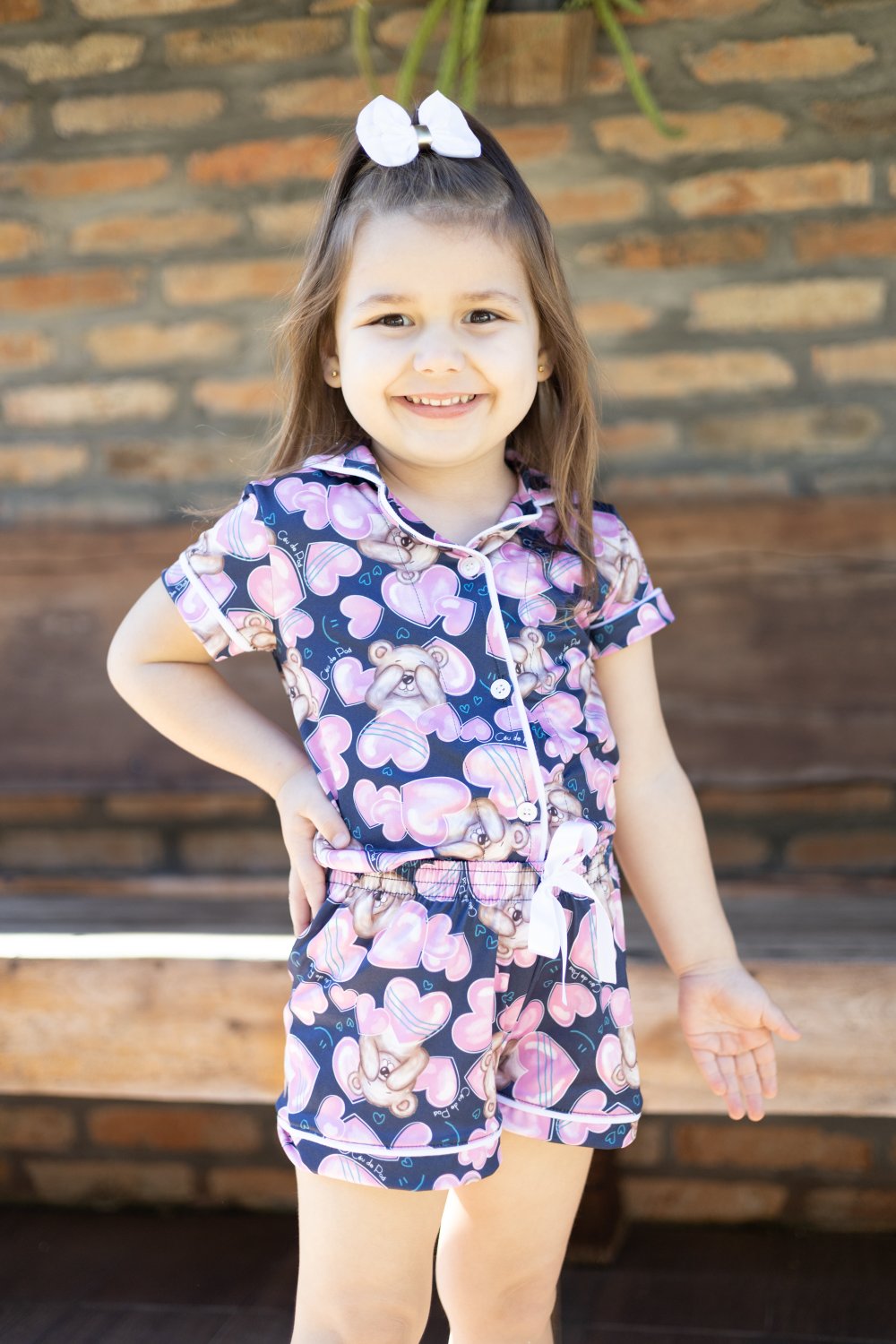 Pijama americano com toque acetinado, blusa aberta com botões e etiqueta dourada como detalhe, corte reto, bermuda com elástico embutido e laço de fita, estampas em 2 opções , cachorro ou urso com corações. Tamanho 2/4/6/8/10.