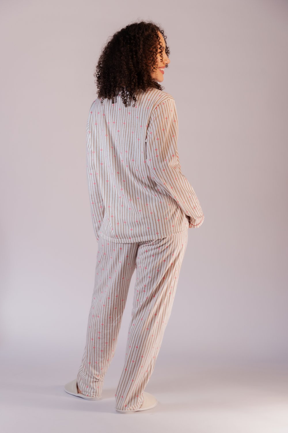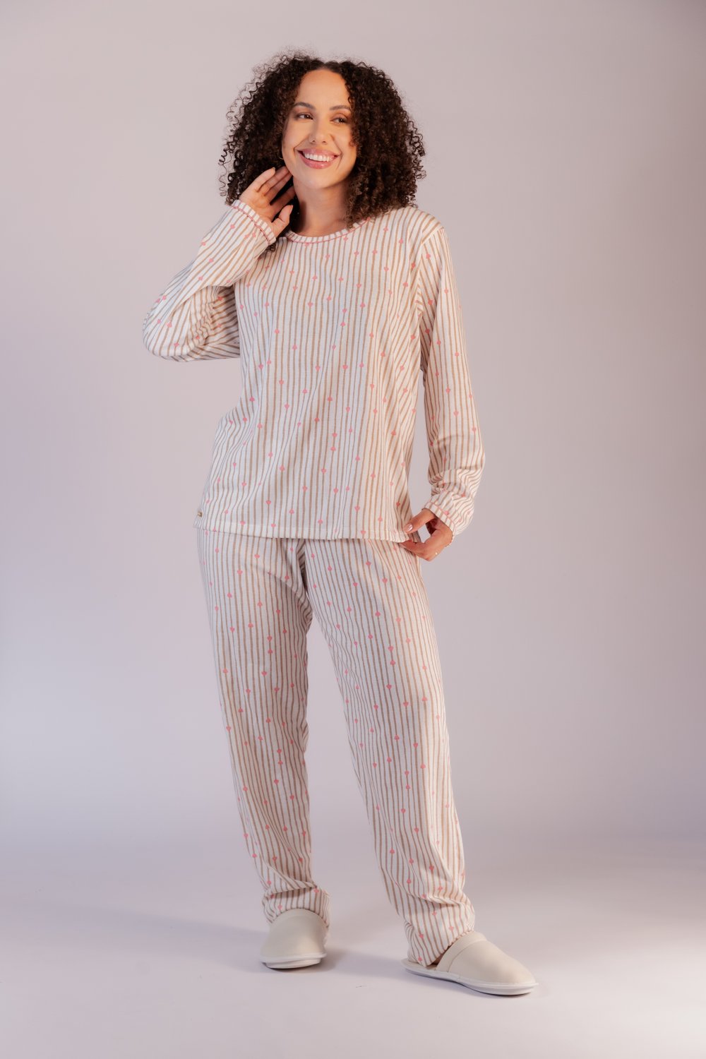 Pijama feminino manga longa, blusa com viés e vivo aplicado na gola e nos punhos, confeccionada em meia malha 100% algodão, calça modelo reto bainha tradicional, perfeito para quem busca conforto e qualidade.