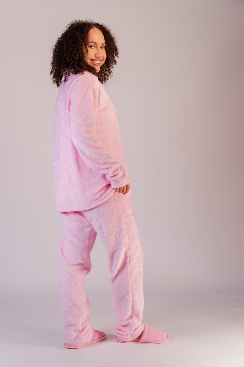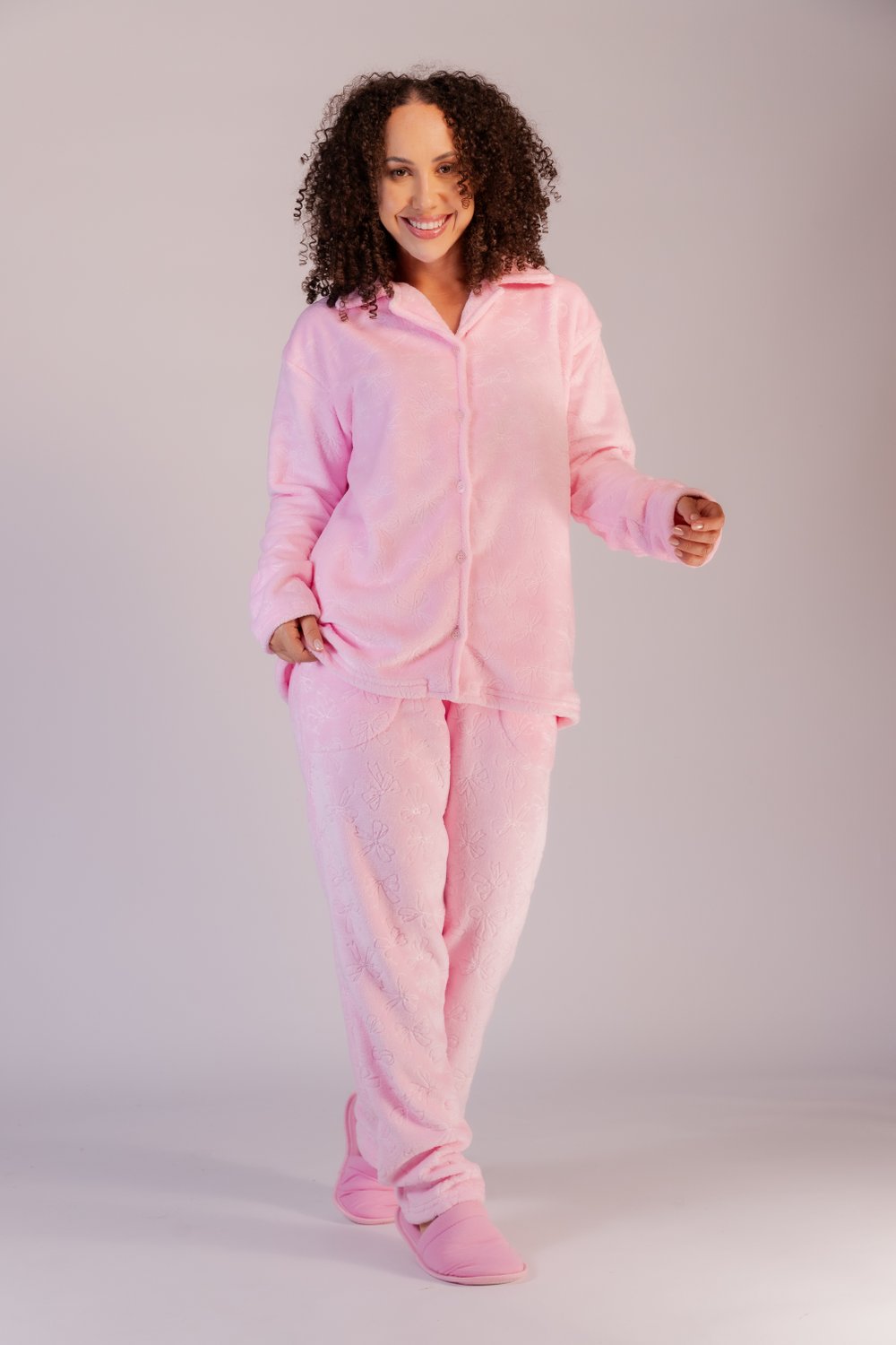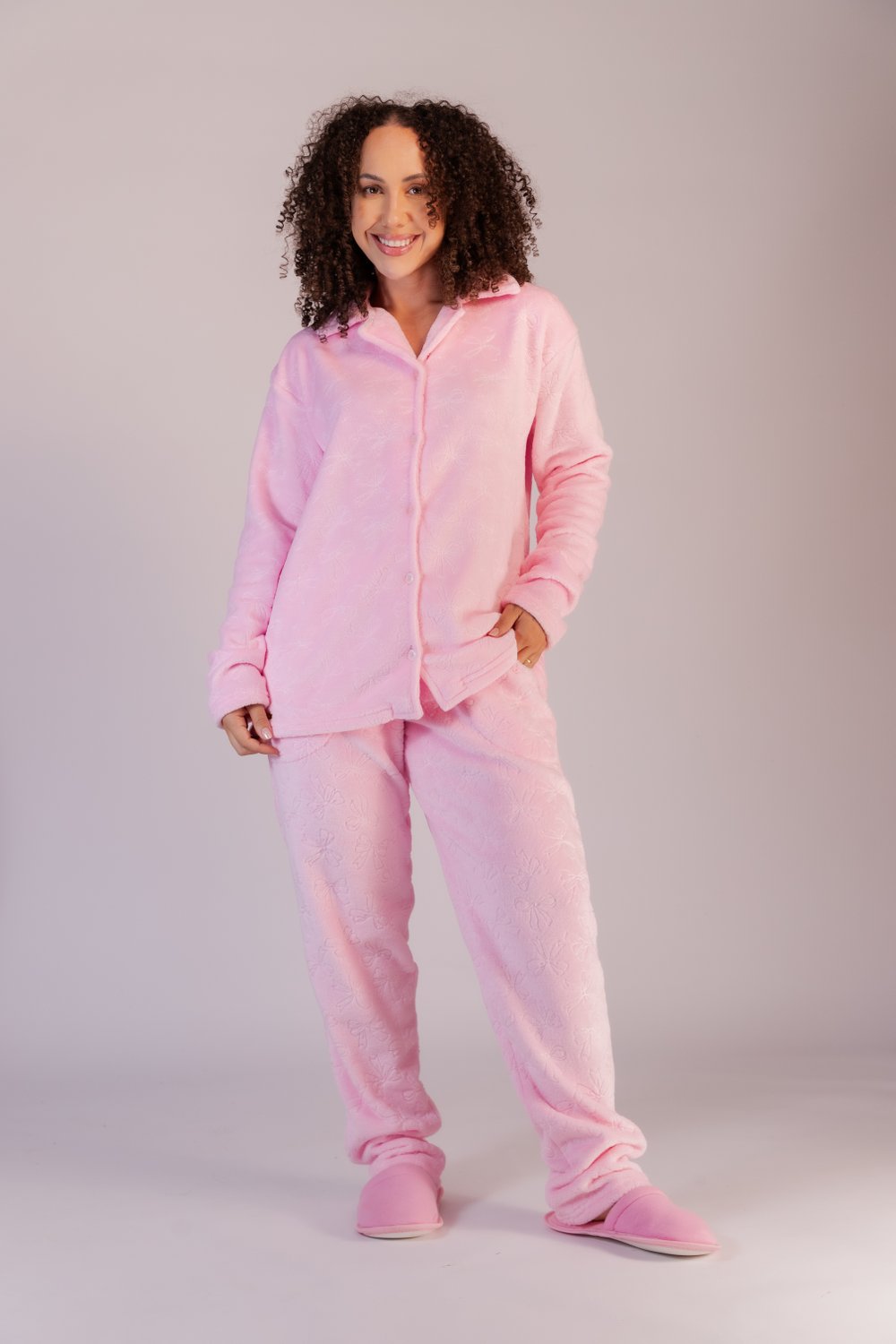 Conjunto de pijama fleece, blusa aberta com gola, botões na frente que permitem facilidade em vestir, com estampa em 3D, modelo reto bainha tradicional, calça com elástico embutido e bainha tradicional, quentinho e confortável, ideal para os dias mais frios. Do P ao GG.