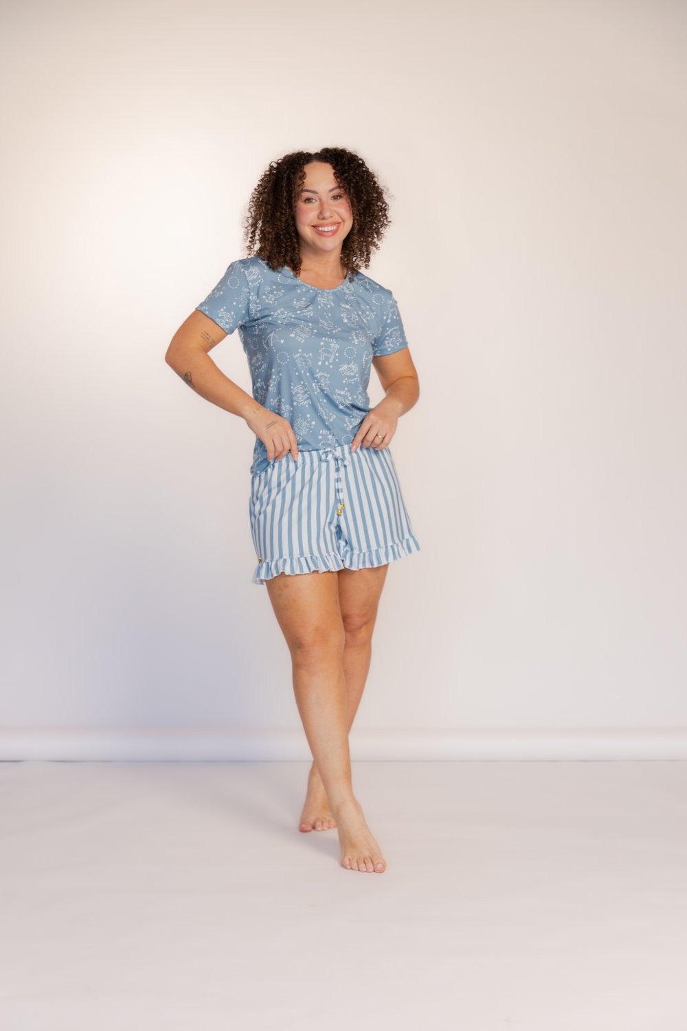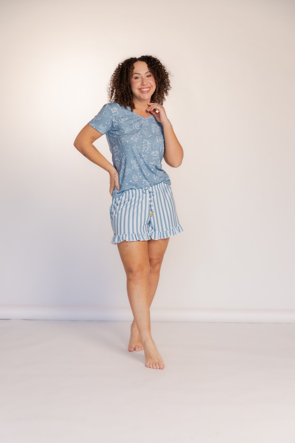 Pijama com estampa de signos, toque super macio, blusa manga curta com viés da cor da peça, decote redondo, modelo reto, bainha tradicional, bermuda em listras com elástico embutido, bainha com babados, vestindo muito bem, super confortável e linda. A combinação de poliéster com o Elastano garante durabilidade e praticidade no seu dia a dia.