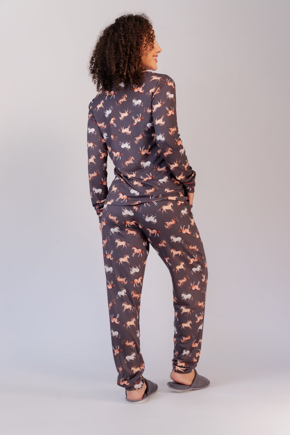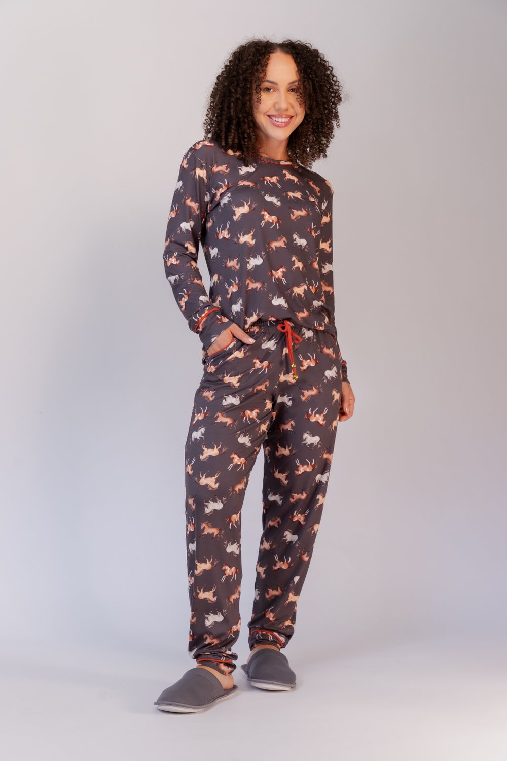 Conjunto de pijama feminino, blusa com estampa de cavalos, vivo nos punhos, decote redondo com vivo, modelo reto, bainha tradicional, calça jogger com estampa de cavalos com vivo e cordinha, elástico embutido, com bolso funcional proporciona conforto e leveza, além de beleza.