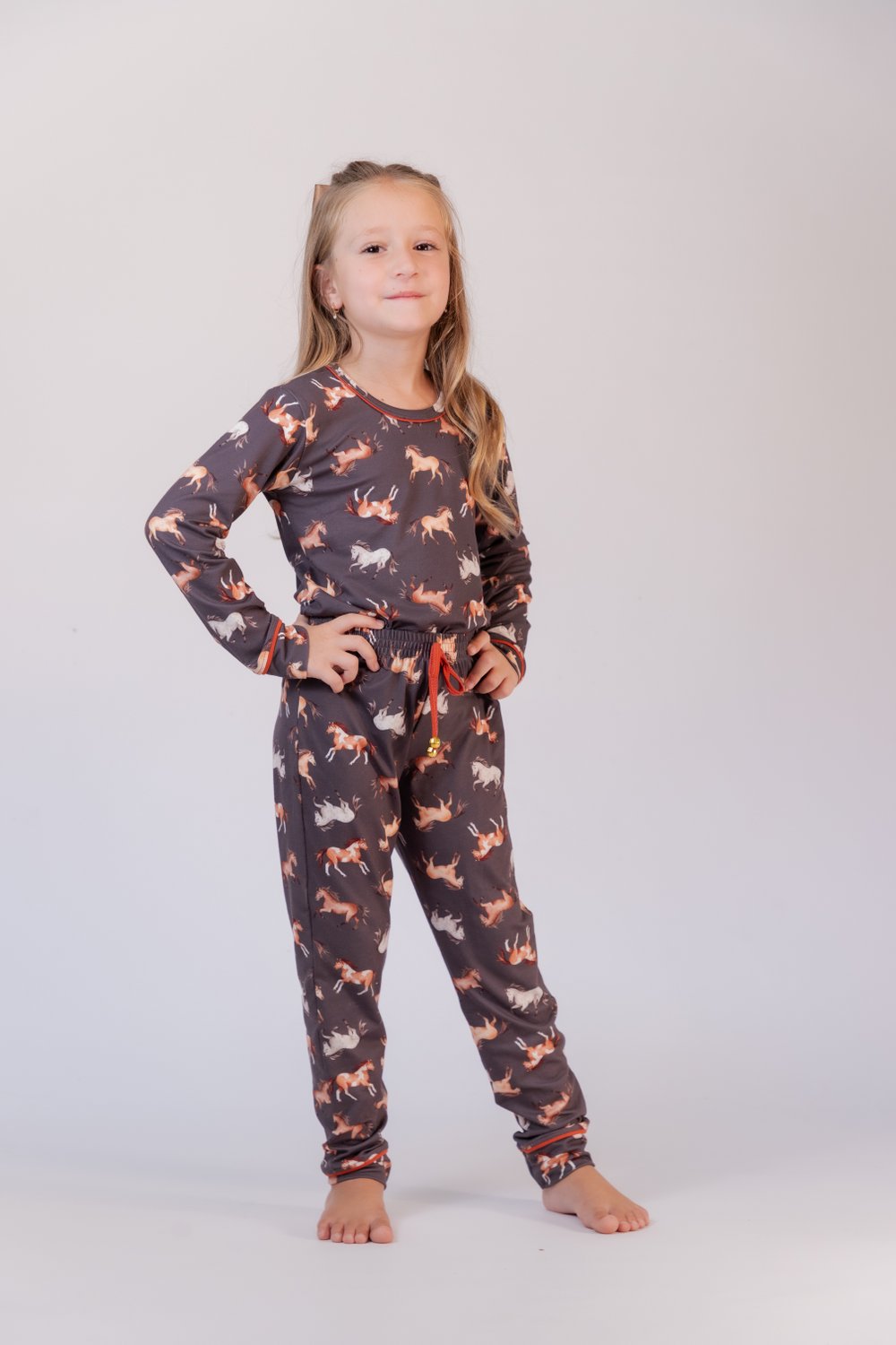 Conjunto de pijama menina, blusa com estampa de cavalos, vivo nos punhos, decote redondo com vivo, modelo reto, bainha tradicional, calça jogger com estampa de cavalos com vivo e cordinha, elástico embutido, proporciona conforto e leveza, além de beleza.