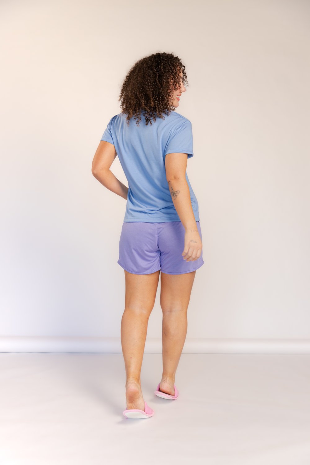 Camiseta em malha de algodão com toque suave (algodão predominante, com poliéster e leve elastano para conforto e recuperação da forma), gola careca e mangas curtas. Estampa frontal “Aloha Koala” de alta definição. Shorts em malha leve tom lilás, com cós elástico e cordão funcional com ponteiras, barra com recorte esportivo e viés.). Indicado para climas quentes e meia-estação. Produto vendido em conjunto: camiseta + shorts.