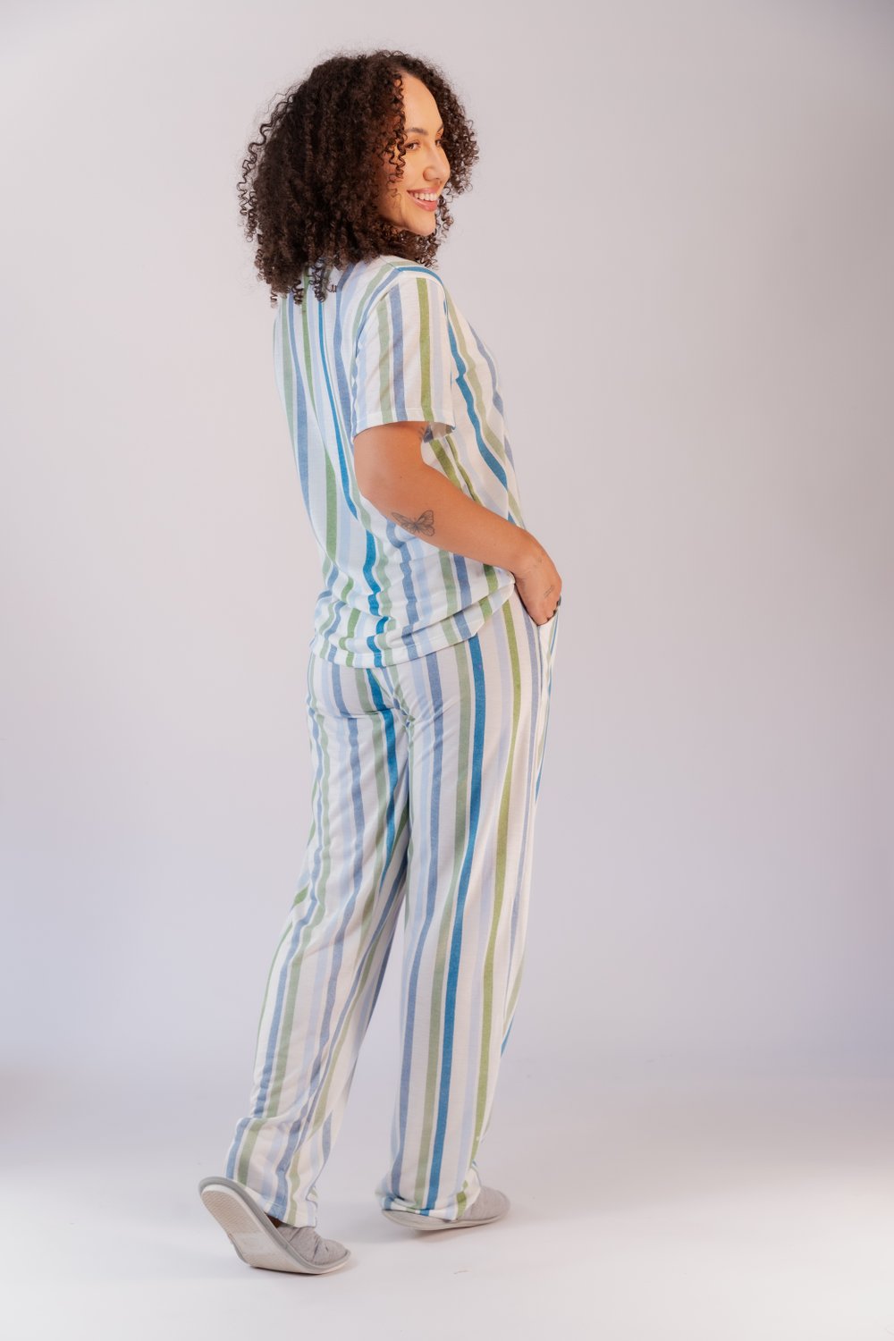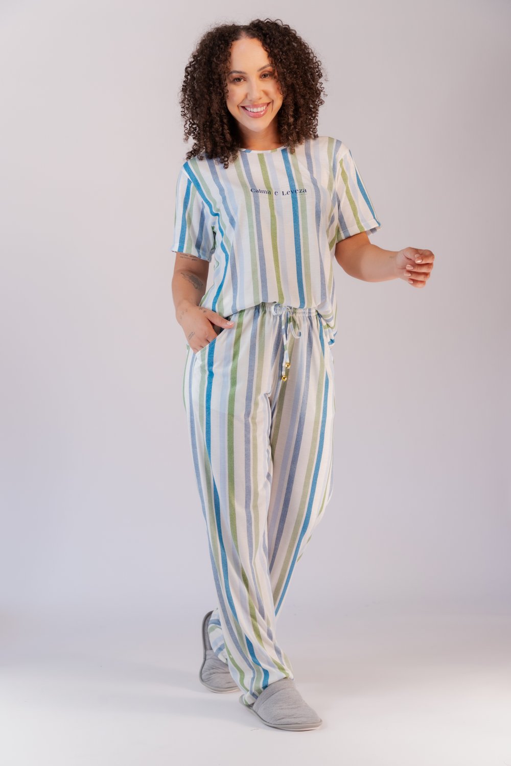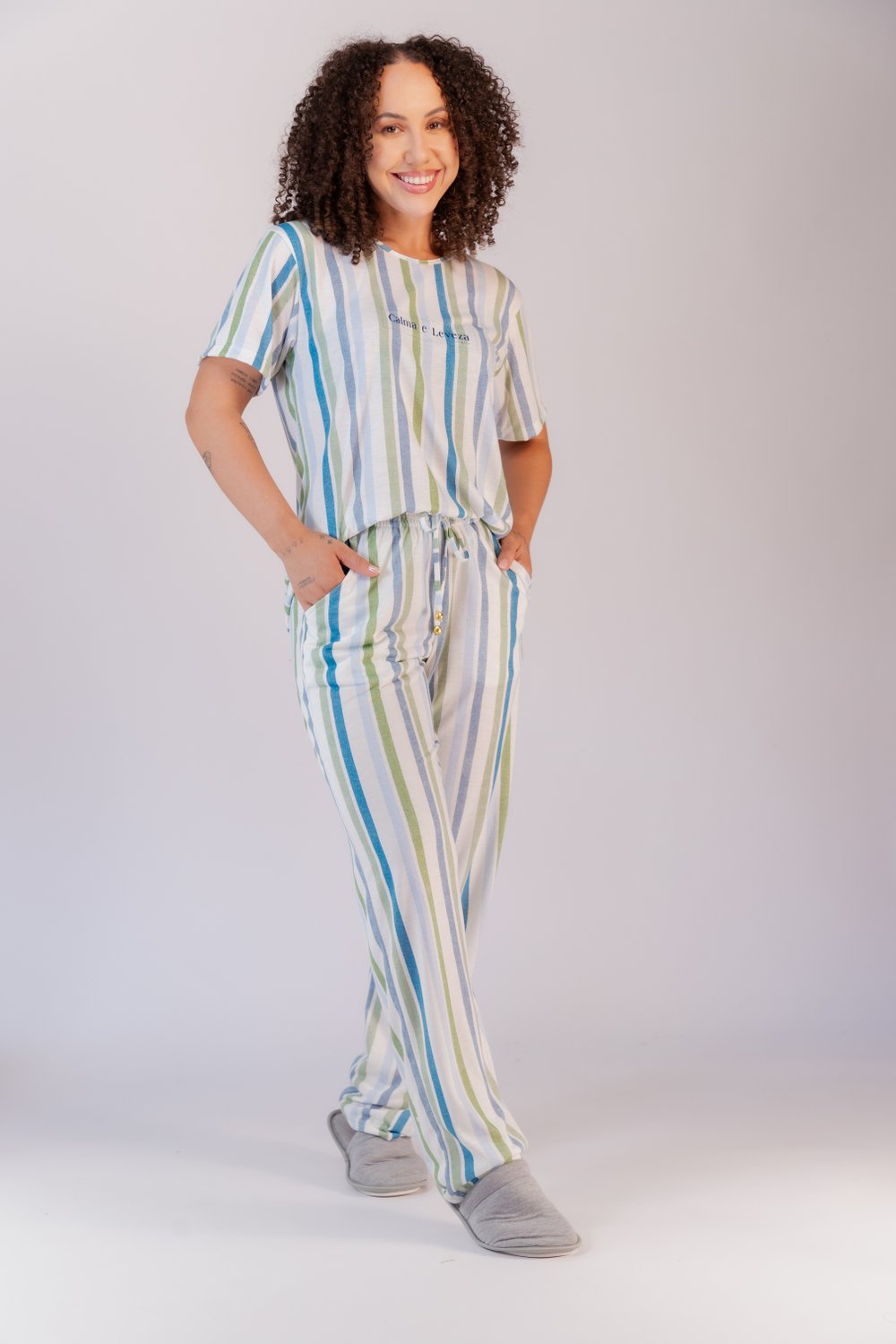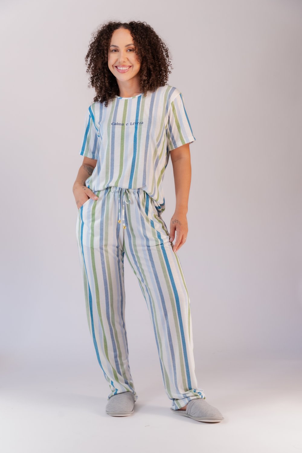Conjunto de pijama poliviscose, blusa decote redondo com viés, modelo reto, bainha tradicional com detalhe de etiqueta dourada, calça com elástico embutido e bolso funcional, moderno e jovial, proporciona conforto e leveza. Tamanhos do P ao GG.