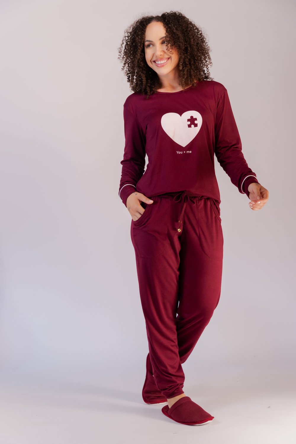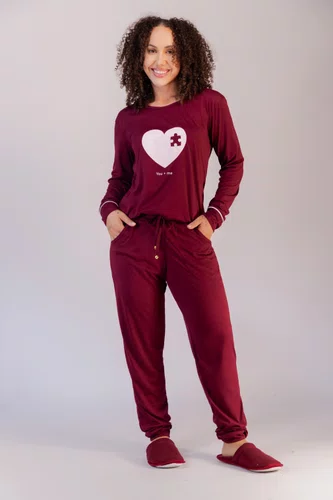 Conjunto de pijama suede feminino, blusa lisa com a estampa de coração com peça tipo quebra cabeça, que encaixa no desenho do pijama masculino, decote redondo com punho e vivo na manga, modelo reto, bainha tradicional, calça jogger lisa, elástico embutido com detalhe de cordão com bolinhas douradas, proporciona conforto e leveza, além de beleza. Tamanho do P ao GG