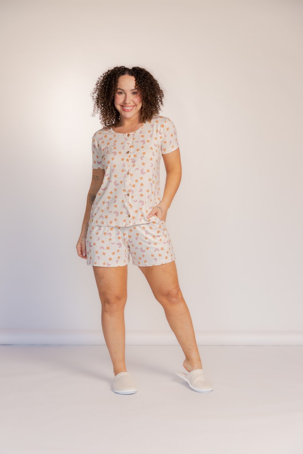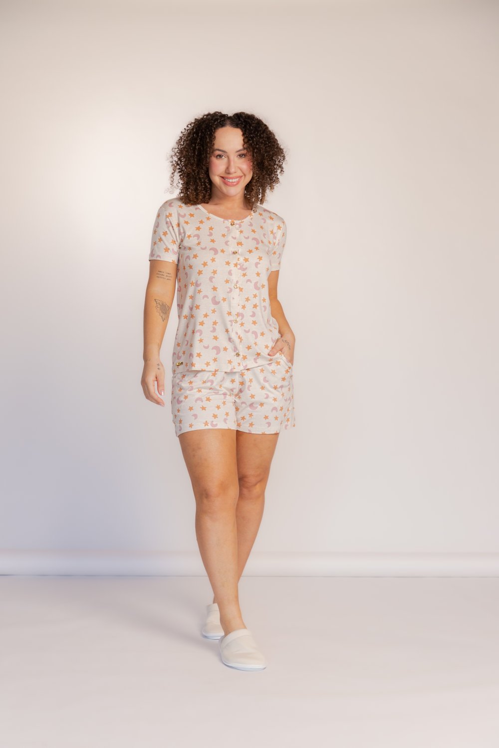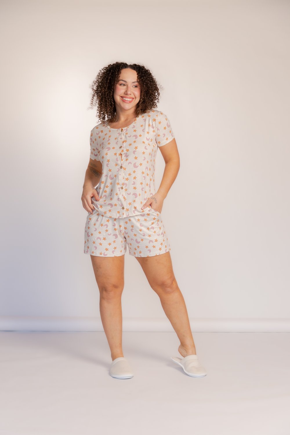 Pijama Estampada de Visco lycra Blusa aberta Shorts com bolso
