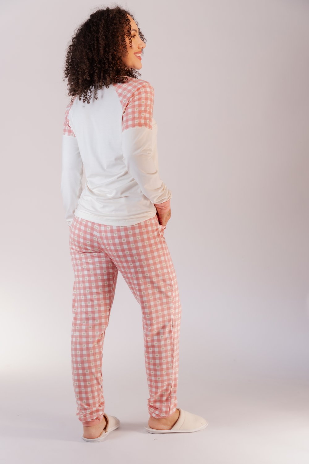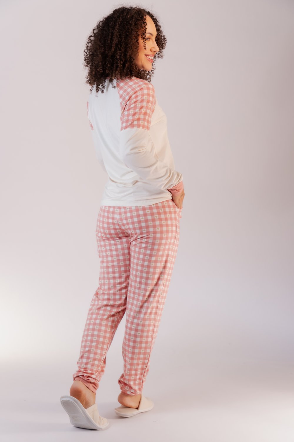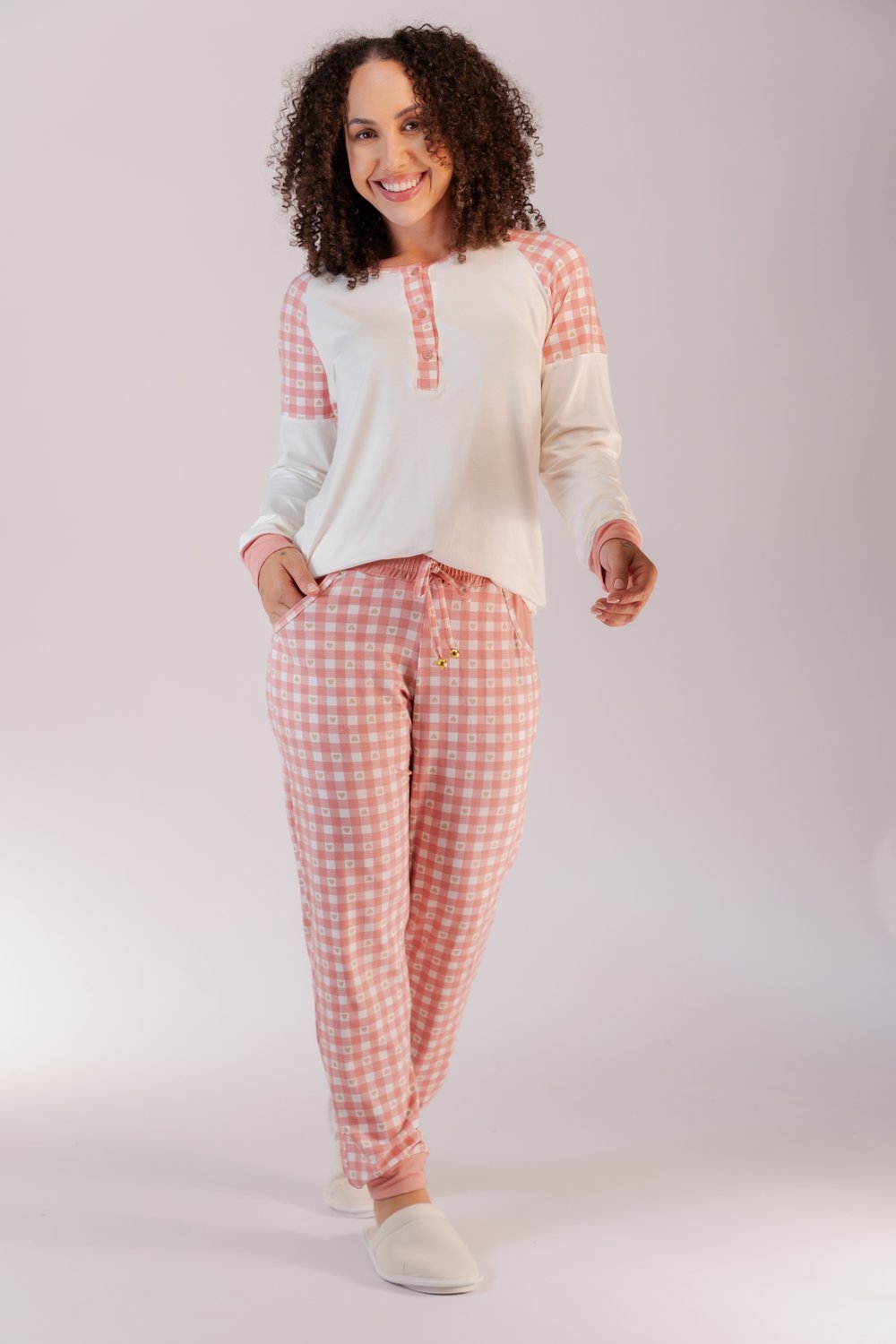 Pijama Visco lycra Feminino Blusa com detalhes em estampa quadriculada.