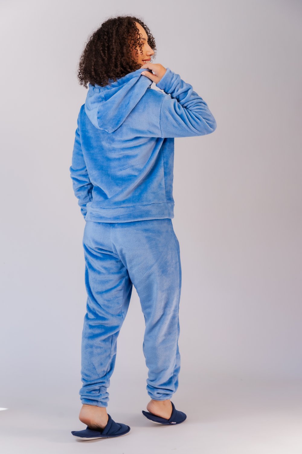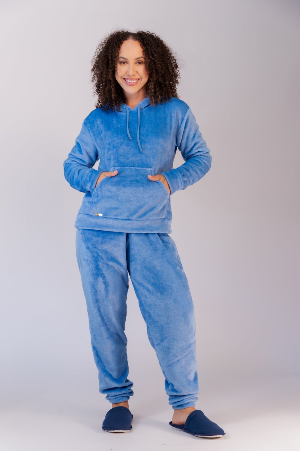 Conjunto de pijama fleece, blusa decote redondo com capuz, bolso canguru, modelo reto com barra na bainha, calça com elástico embutido, quentinho e confortável, ideal para os dias mais frios. Do P ao GG. Disponível em algumas cores para casal.
