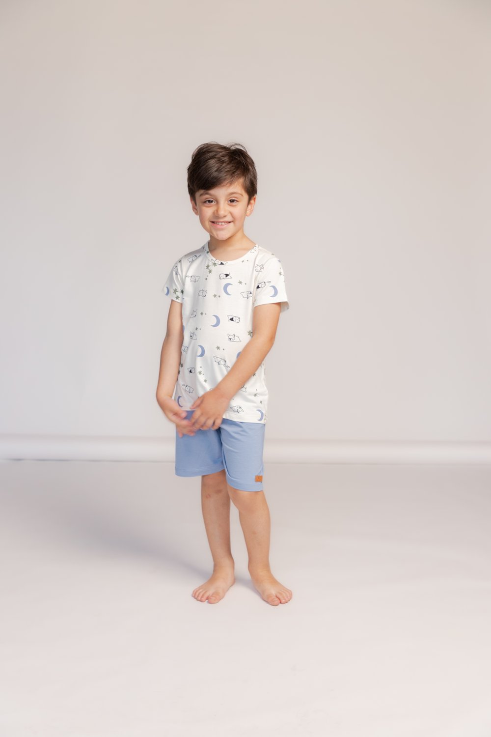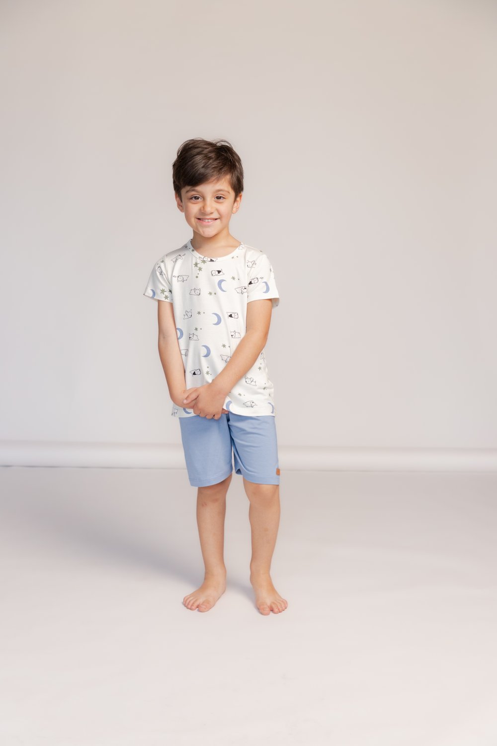 Conjunto de pijama manga curta visco lycra, blusa estampada, modelo reto, viés igual a estampa da blusa, bainha tradicional, bermuda lisa com elástico embutido, etiqueta de couro na perna , bainha reta modelo tradicional, proporciona conforto e leveza, além de beleza.