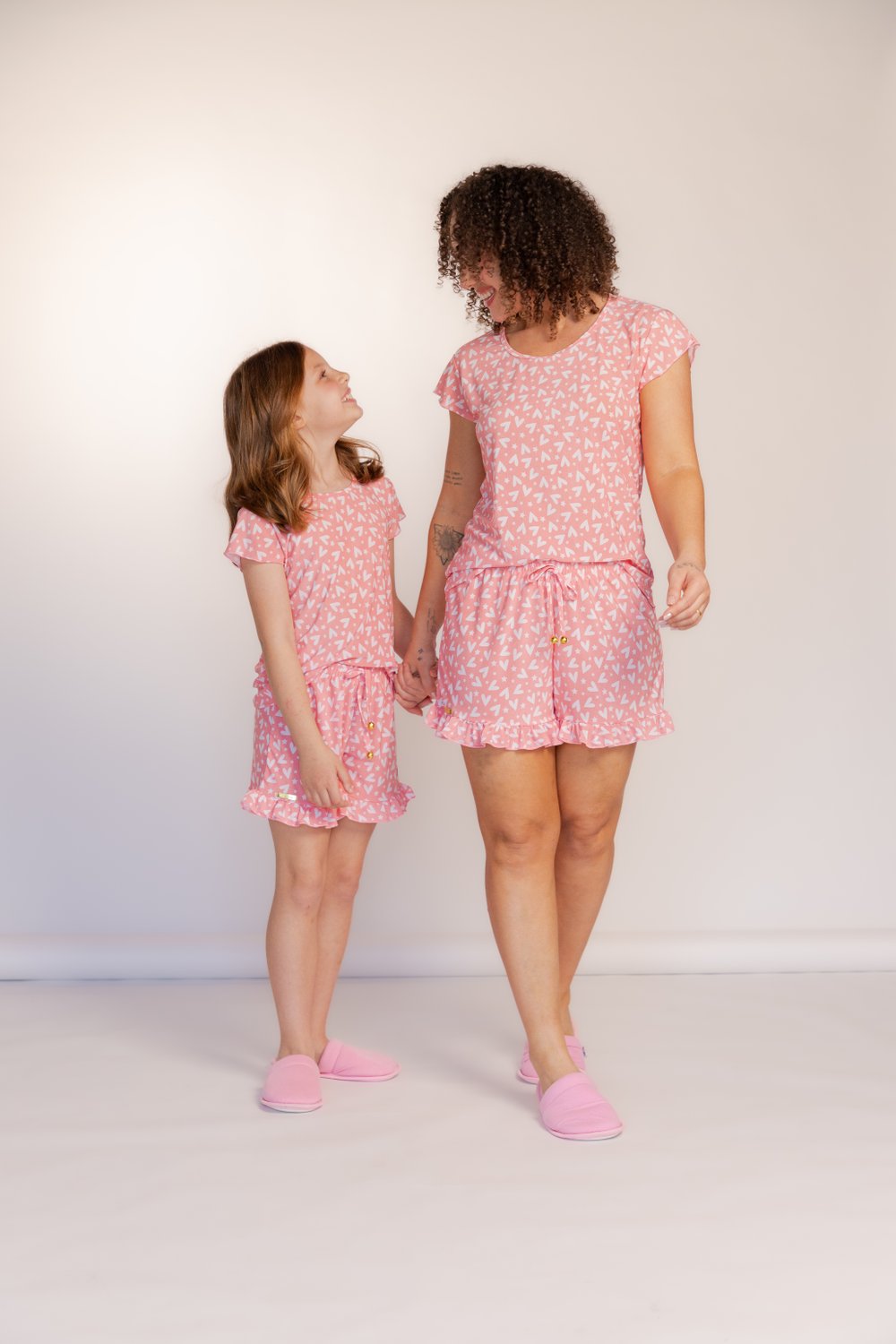 Conjunto de pijama com toque geladinho, decote redondo, modelo reto, manguinha e bainha com fru-fru, short com babado e fru-fru, elástico embutido com tirinhas e terminal dourado, super confortável e lindo. Tamanho Infantil 2/4/6/8/10.