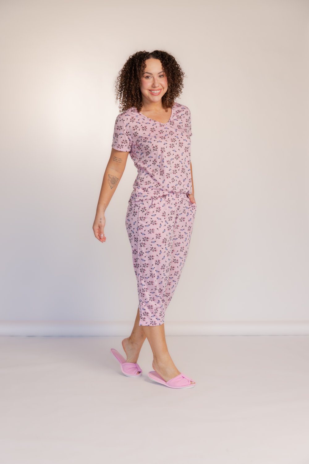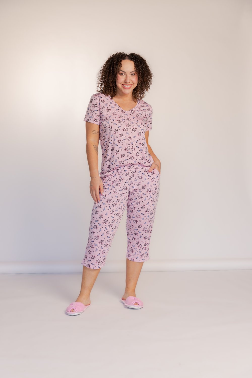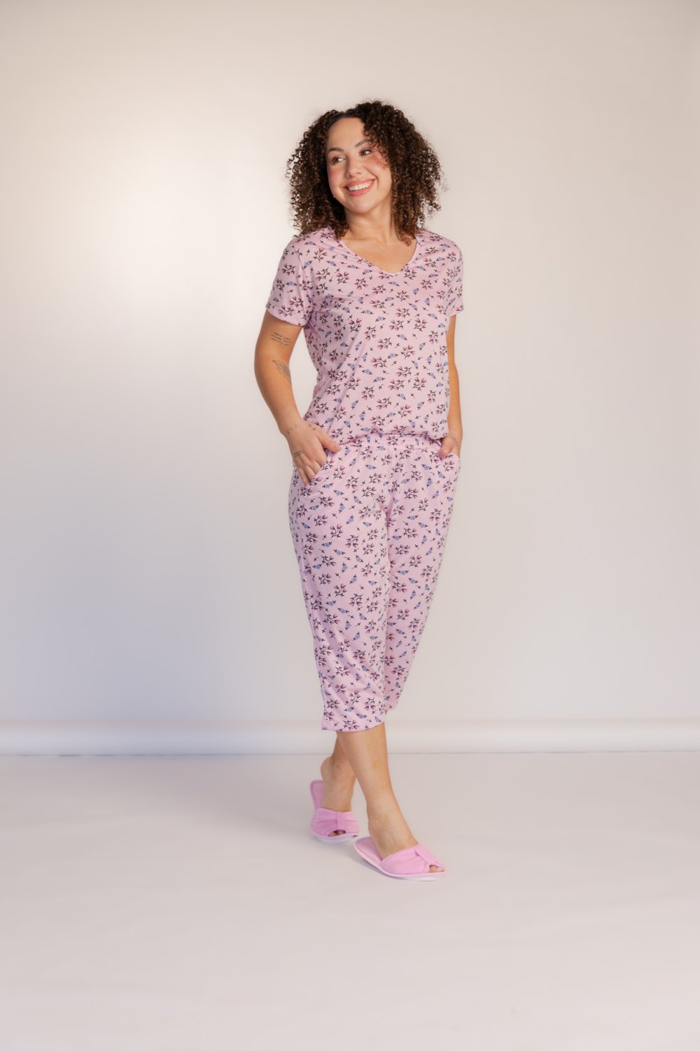 Pijama Feminino blusa manga curta, decote V com viés da cor da peça, bermuda com bolsos, modelo pescador abaixo dos joelhos, elástico embutido bainha tradicional.