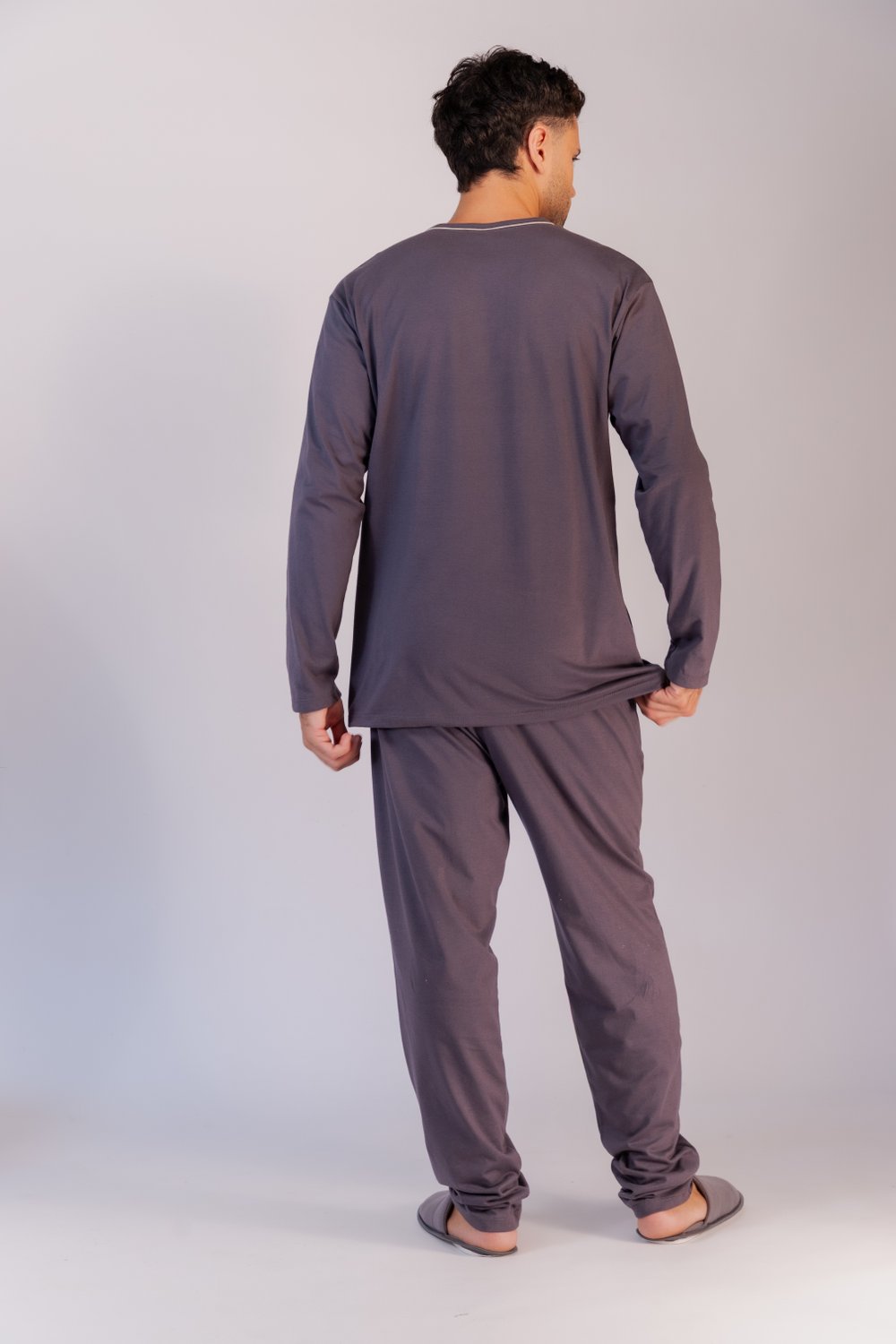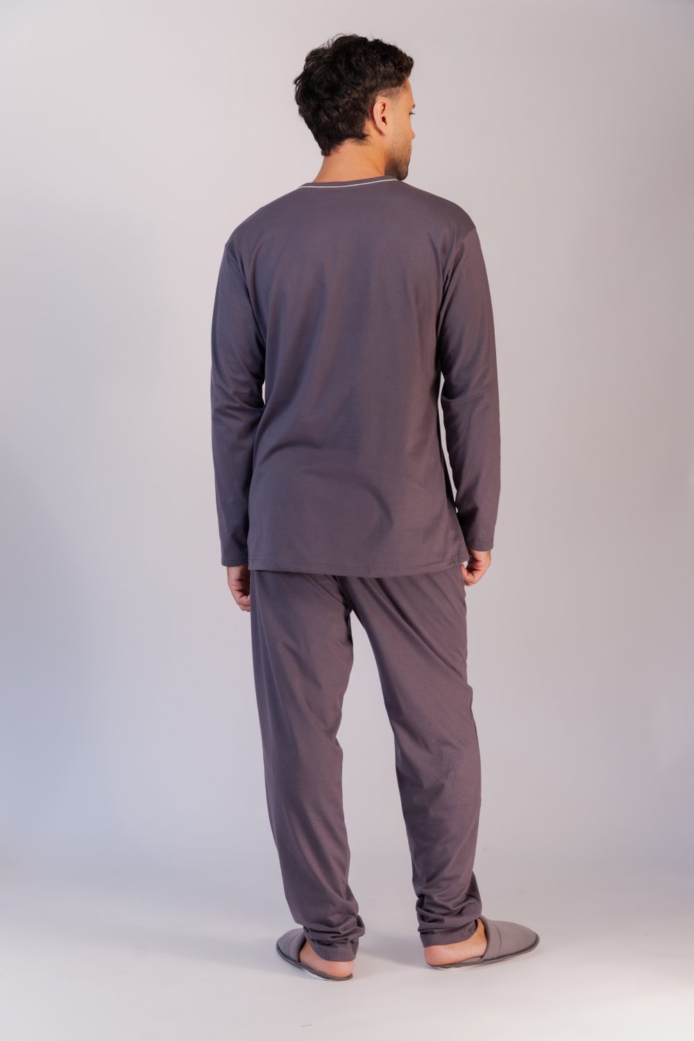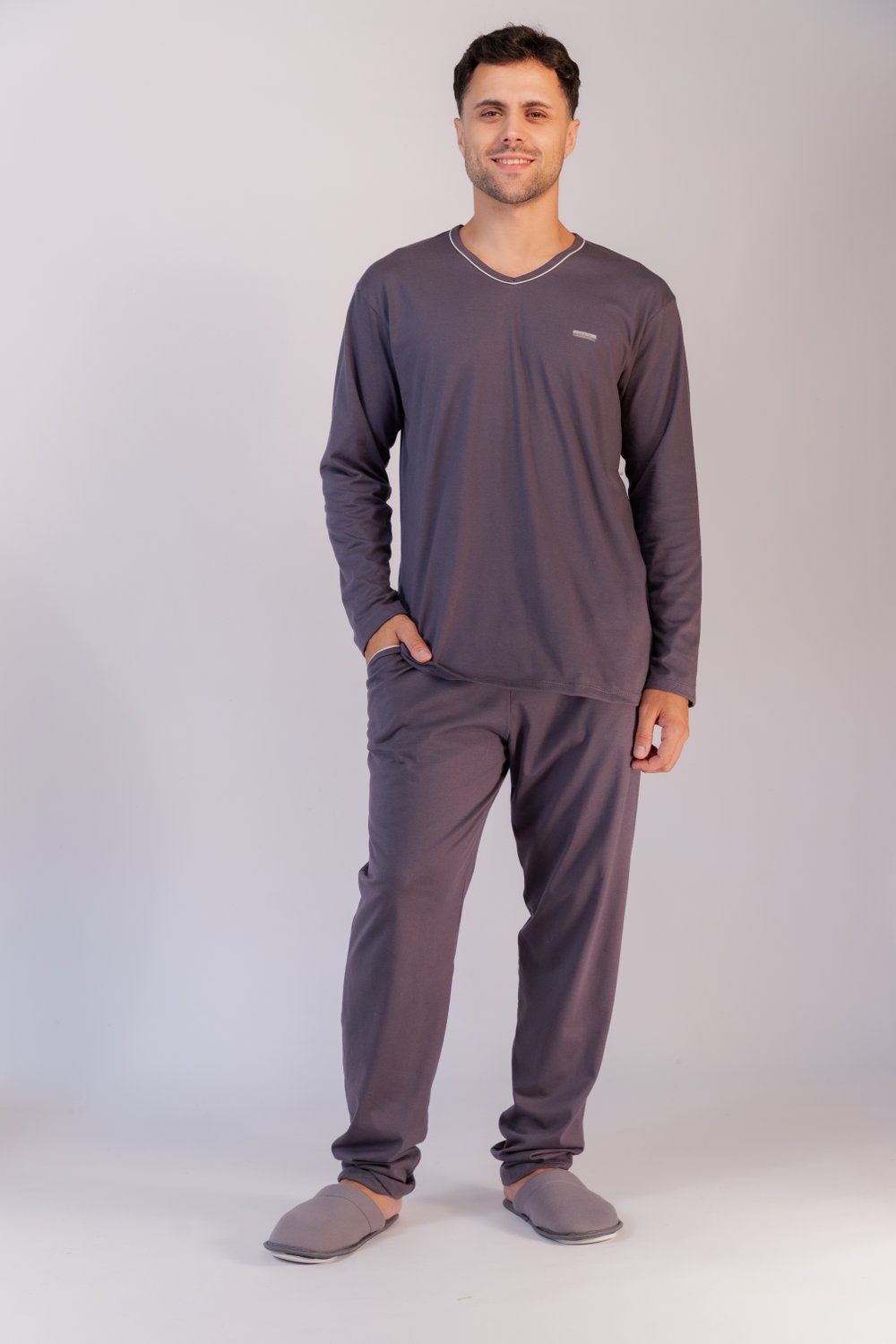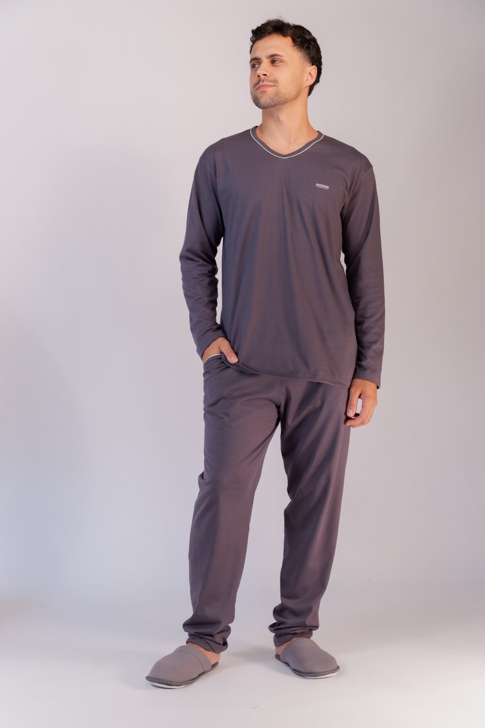Pijama masculino, blusa manga comprida, decote v com vivo aplicado, detalhe com etiqueta na frente, bainha tradicional, calça com elástico embutido bainha tradicional com vivo no bolso. O resultado é um conjunto versátil, leve e fresco, mantendo um visual alinhado e discreto.