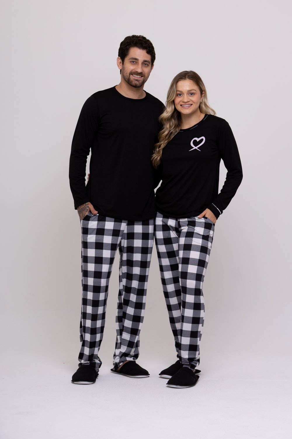 Conjunto de pijama suede, blusa lisa, decote redondo com viés, manga longa, modelo reto, bainha tradicional, calça com cós e bolso, proporciona conforto e leveza, além de beleza para o casal.