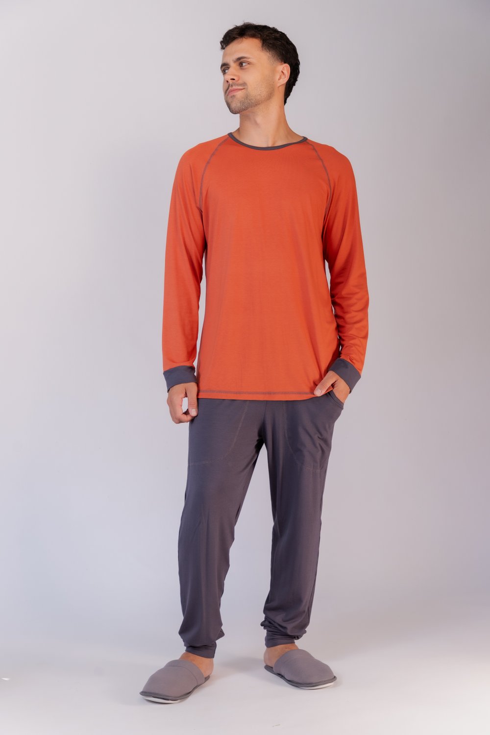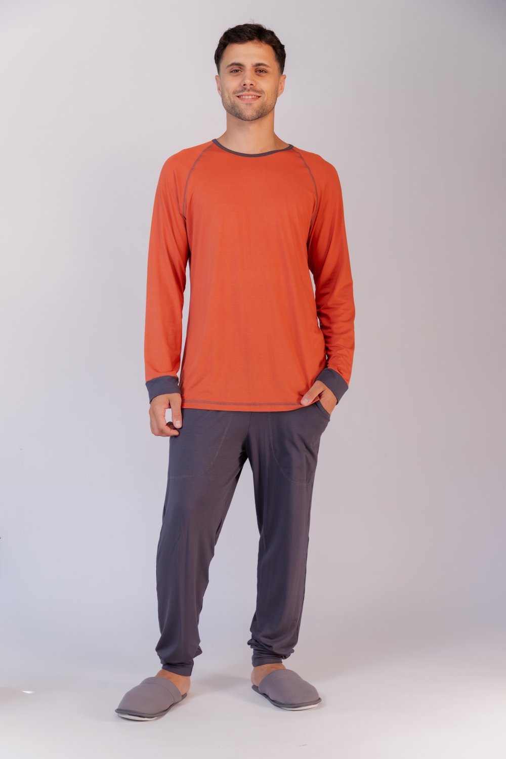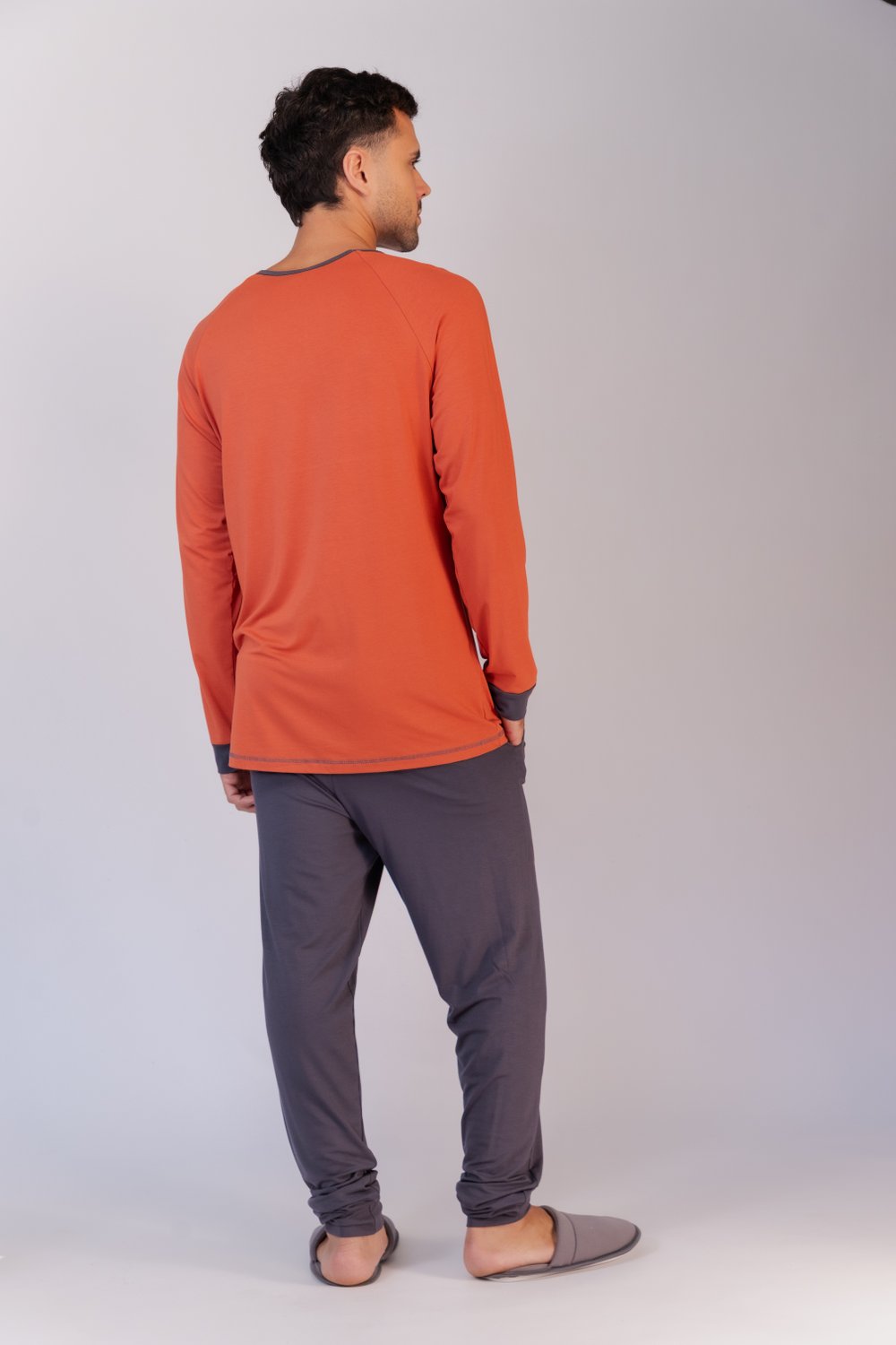 Conjunto de pijama masculino em visco lycra , blusa lisa costuras com trama, punhos da cor da calça, decote redondo com vivo, modelo reto, bainha tradicional, calça jogger lisa com elástico embutido, com bolso funcional proporciona conforto e leveza, além de beleza.