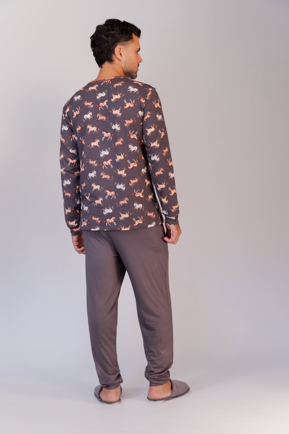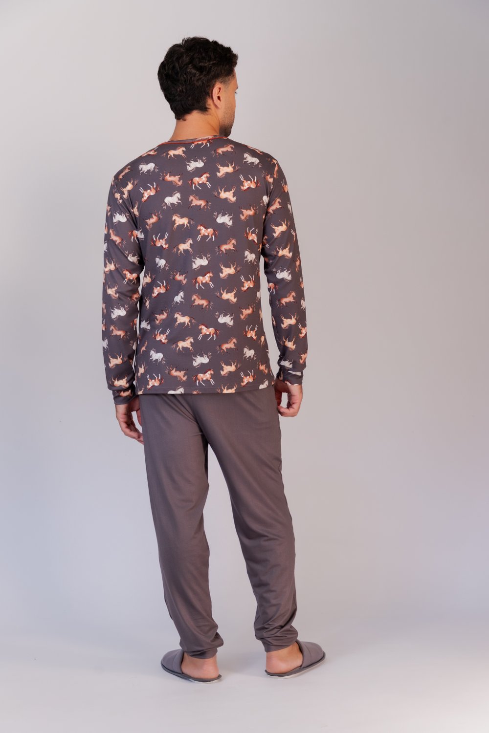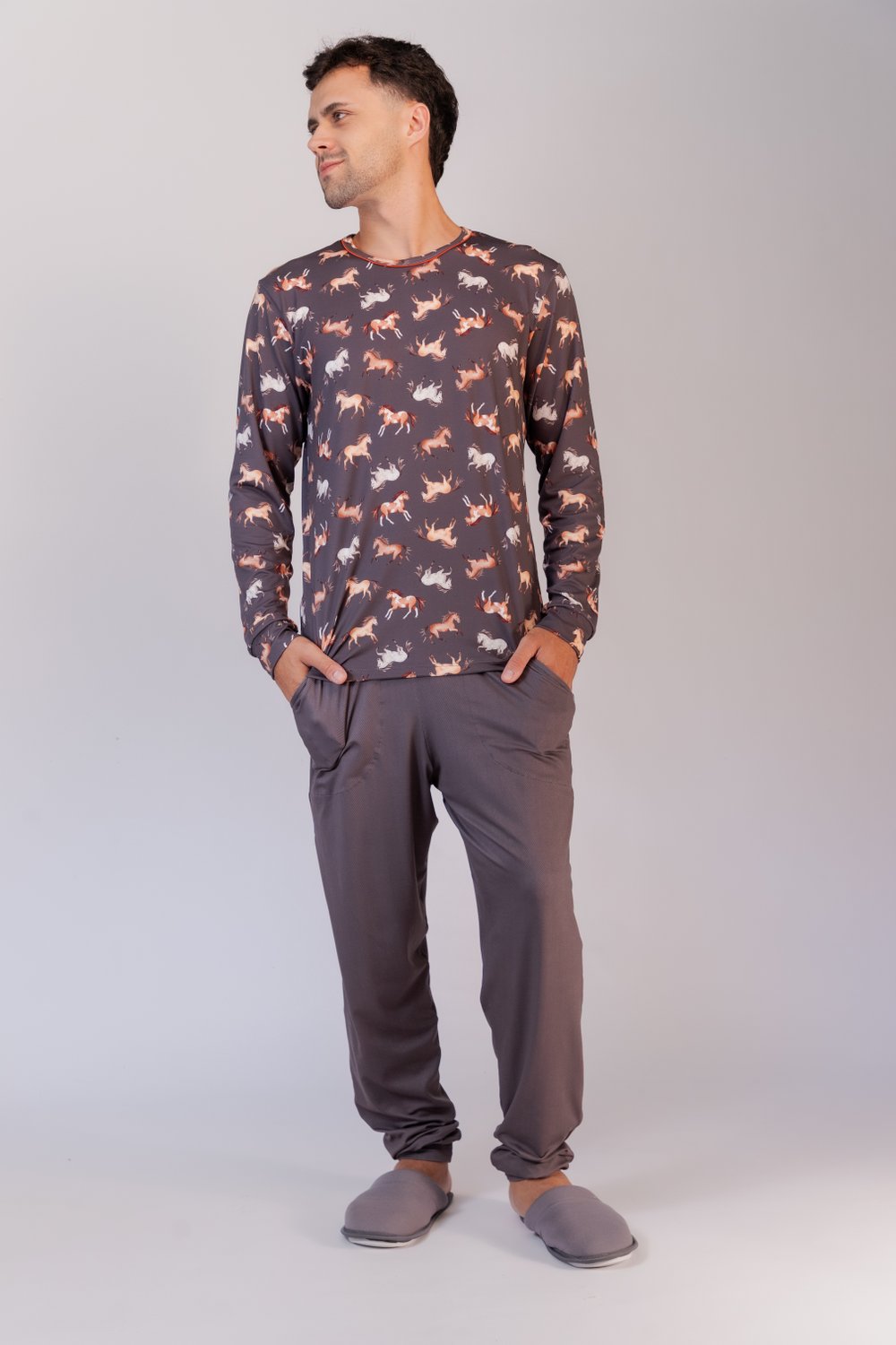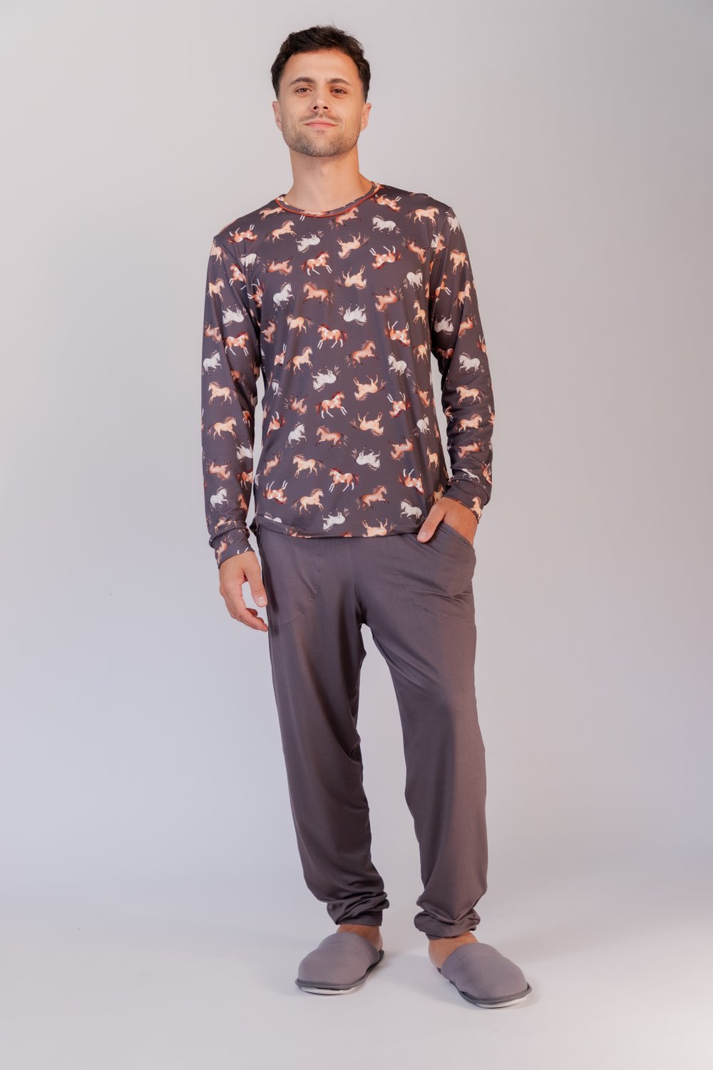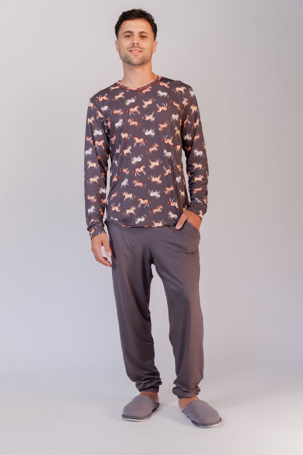 Conjunto de pijama masculino , blusa com estampa de cavalos, com punhos, decote redondo com vivo, modelo reto, bainha tradicional, calça jogger lisa com elástico embutido, com bolso funcional proporciona conforto e leveza, além de beleza.