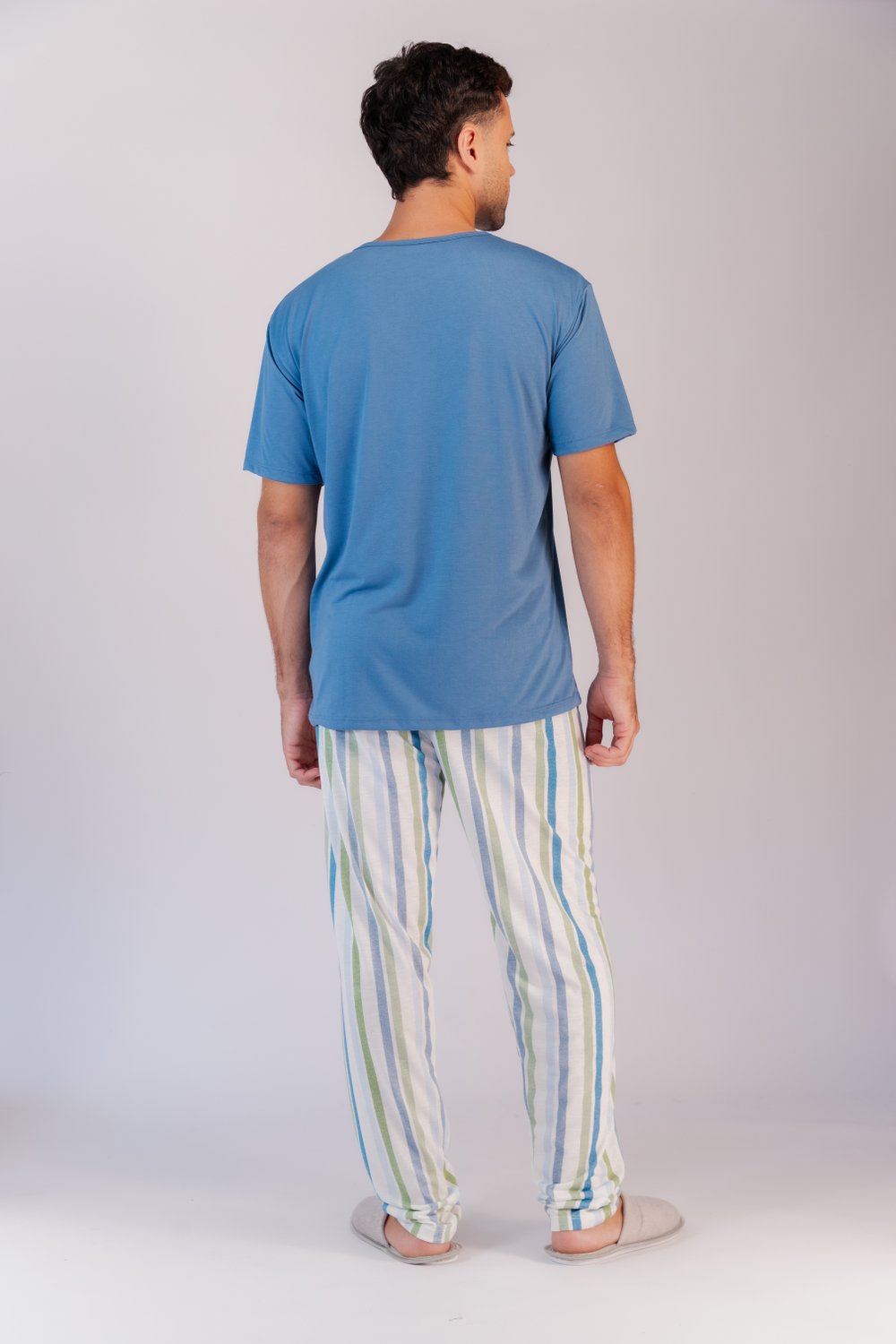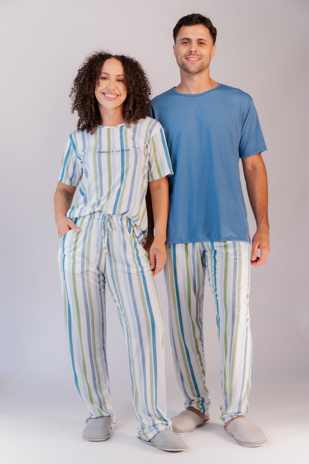 Conjunto de pijama poliviscose, blusa decote redondo com viés, modelo reto, blusa lisa, bainha tradicional com detalhe de etiqueta de couro, calça estampada com elástico embutido e bolso funcional, moderno e jovial, proporciona conforto e leveza. Tamanhos do P ao GG.