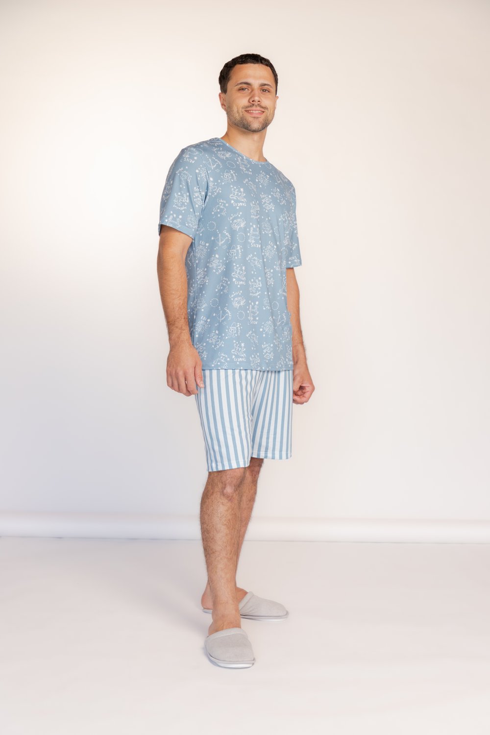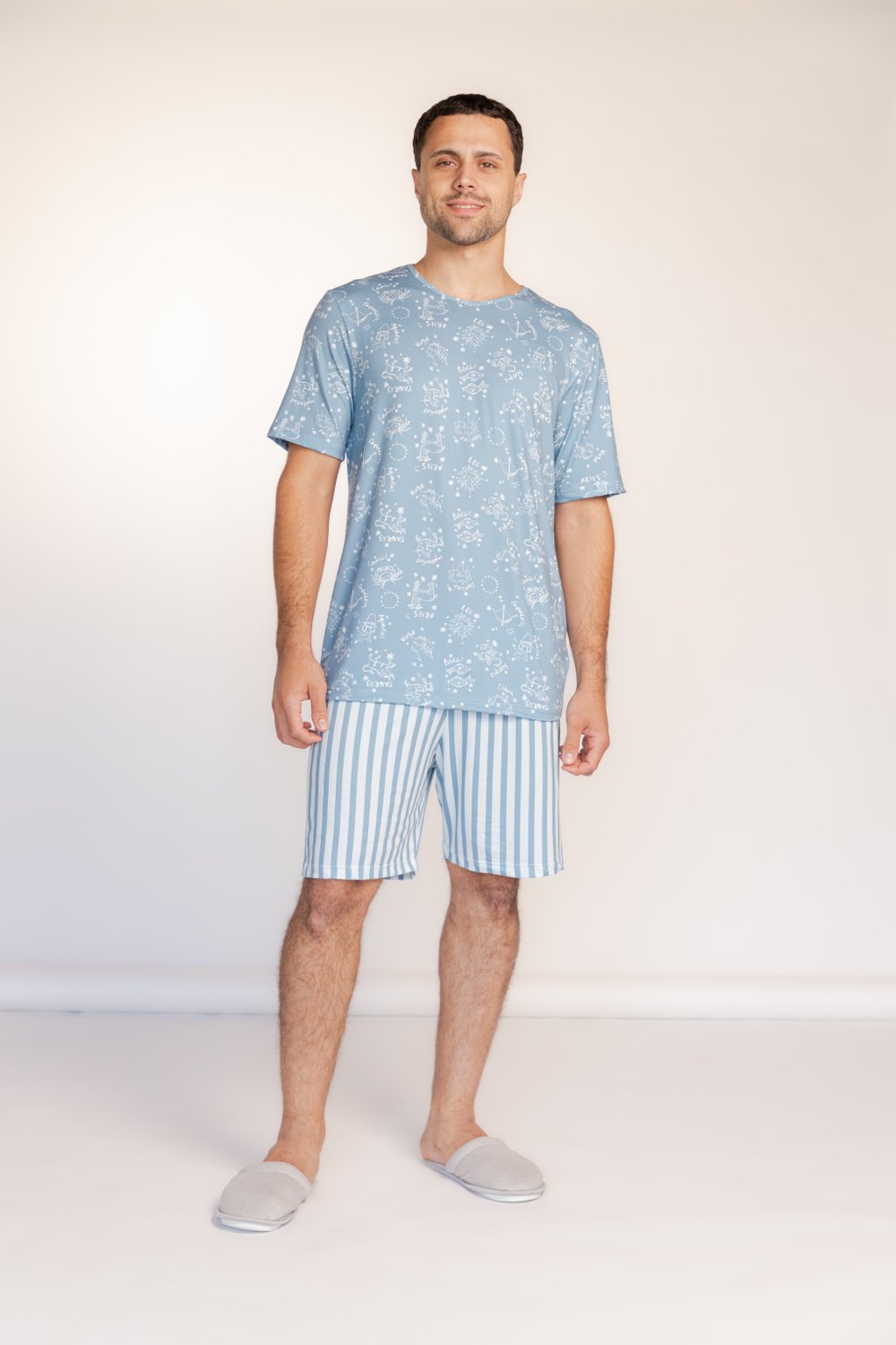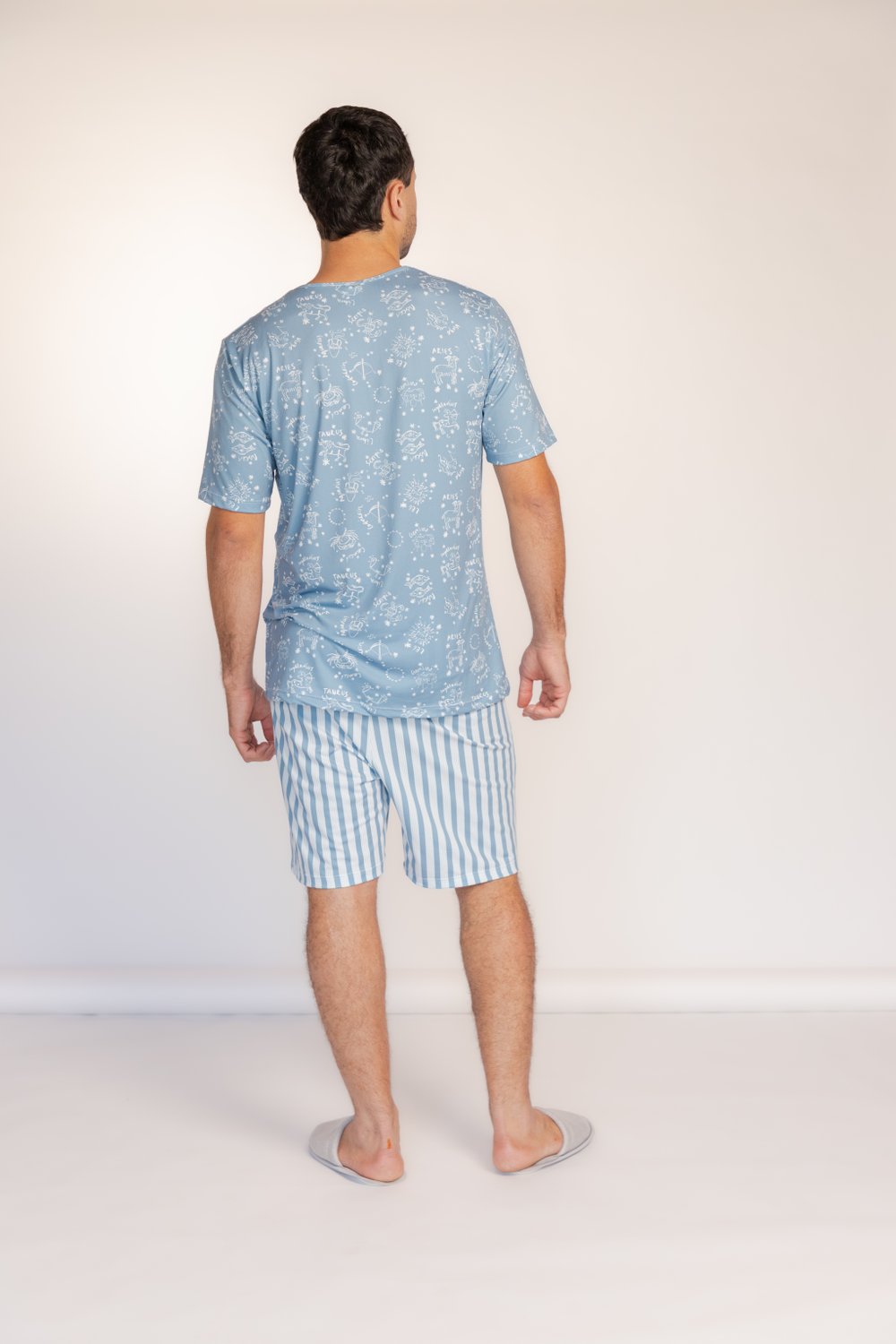 Conjunto de pijama Dreams, blusa com estampa se signos, decote redondo com viés da cor da peça, modelo reto, bainha tradicional com detalhe de etiqueta de couro, bermuda listrada com elástico embutido, moderno e jovial, proporciona conforto e leveza.