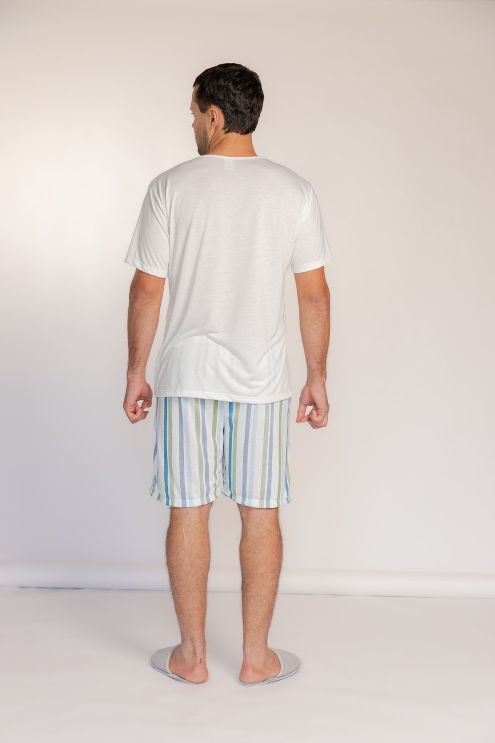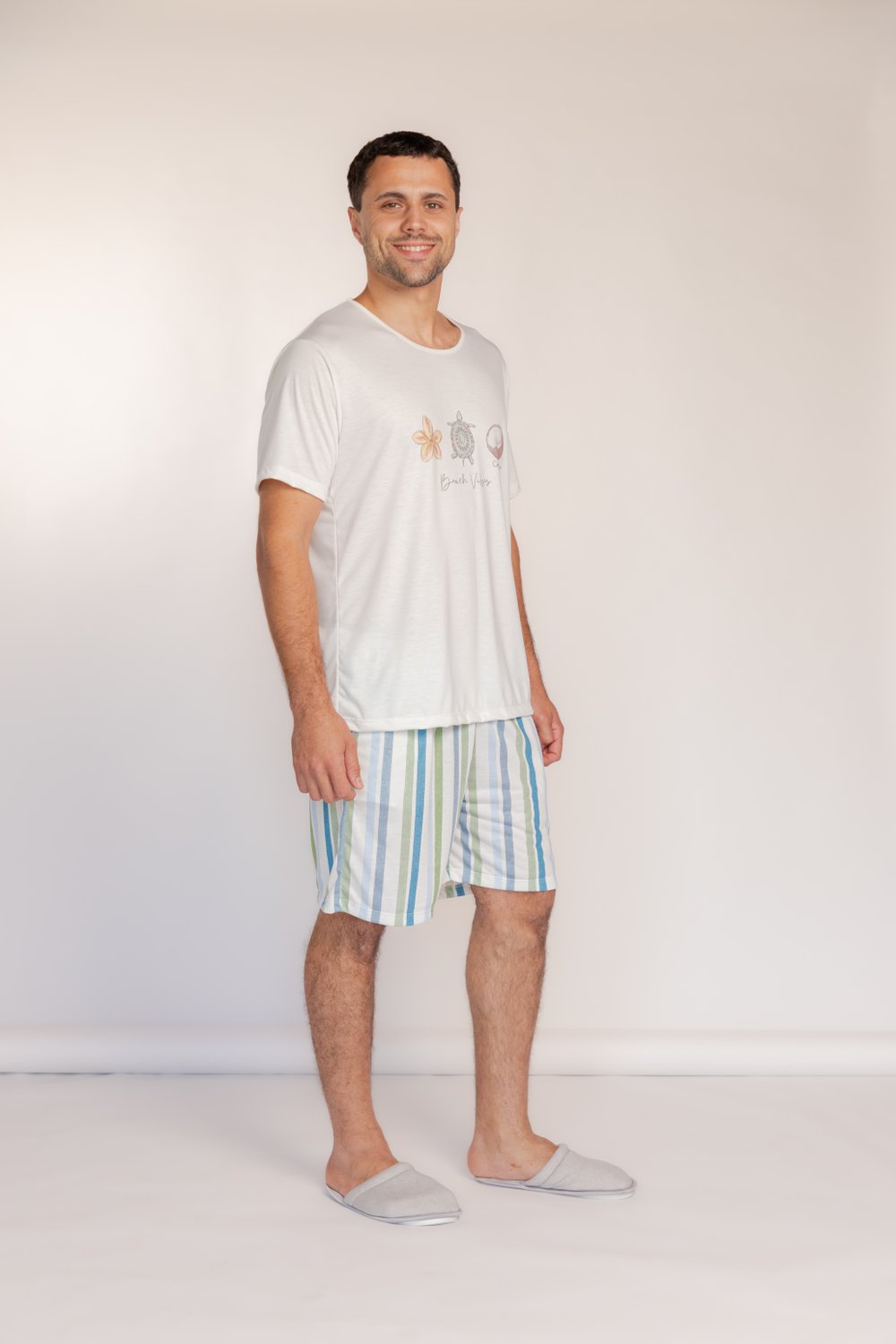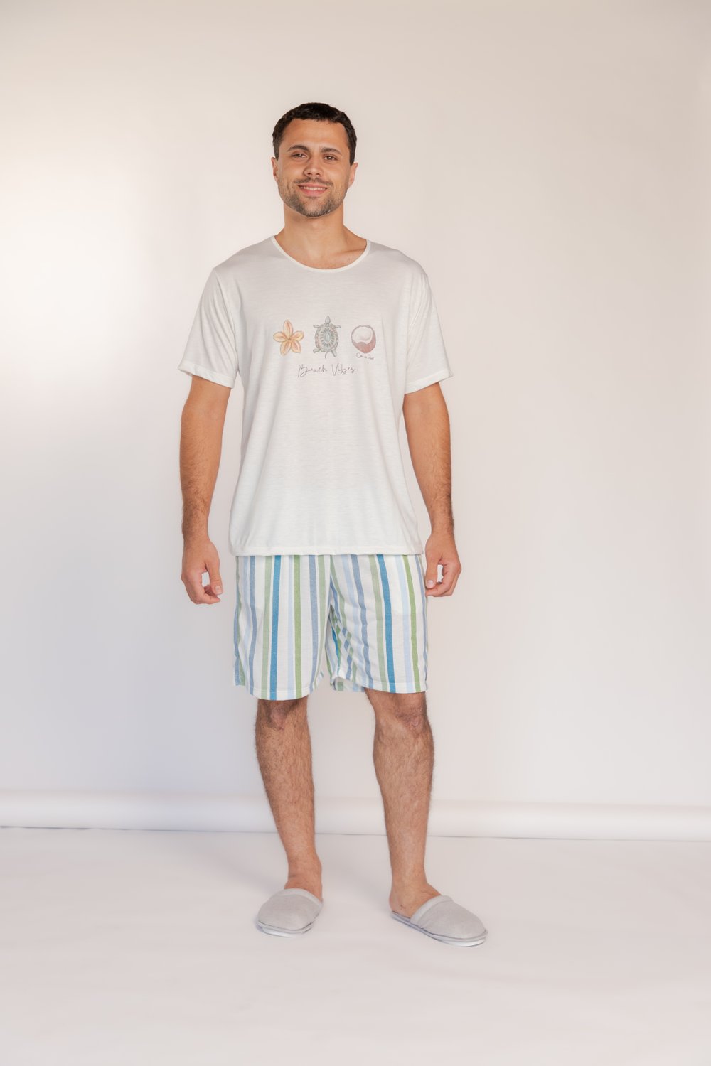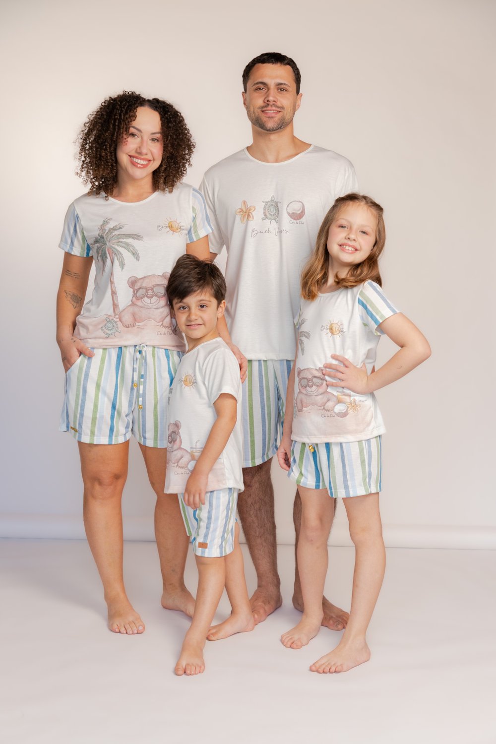 Pijama Masculino curto, leve e divertido, desenvolvido para oferecer conforto e frescor nas noites de primavera e verão. Com blusa estampada de urso estilizado e shorts listrado em tons suaves, traz modernidade e charme para os momentos de descanso e lazer em casa.