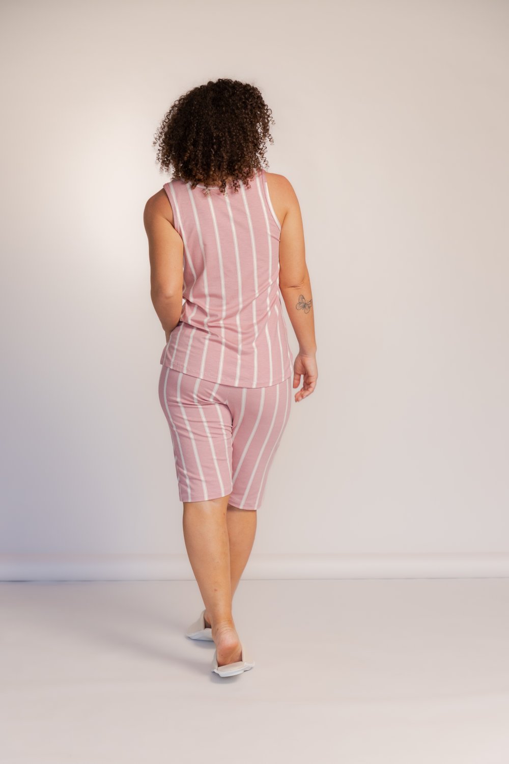 Conjunto de pijama visco lycra, regata semi aberta com viés, modelo reto, bainha tradicional, detalhe etiqueta dourada, lateral aberta, bermuda pescador com elástico embutido, bainha tradicional, proporciona conforto e leveza, além de beleza. Tamanhos do P ao GG.