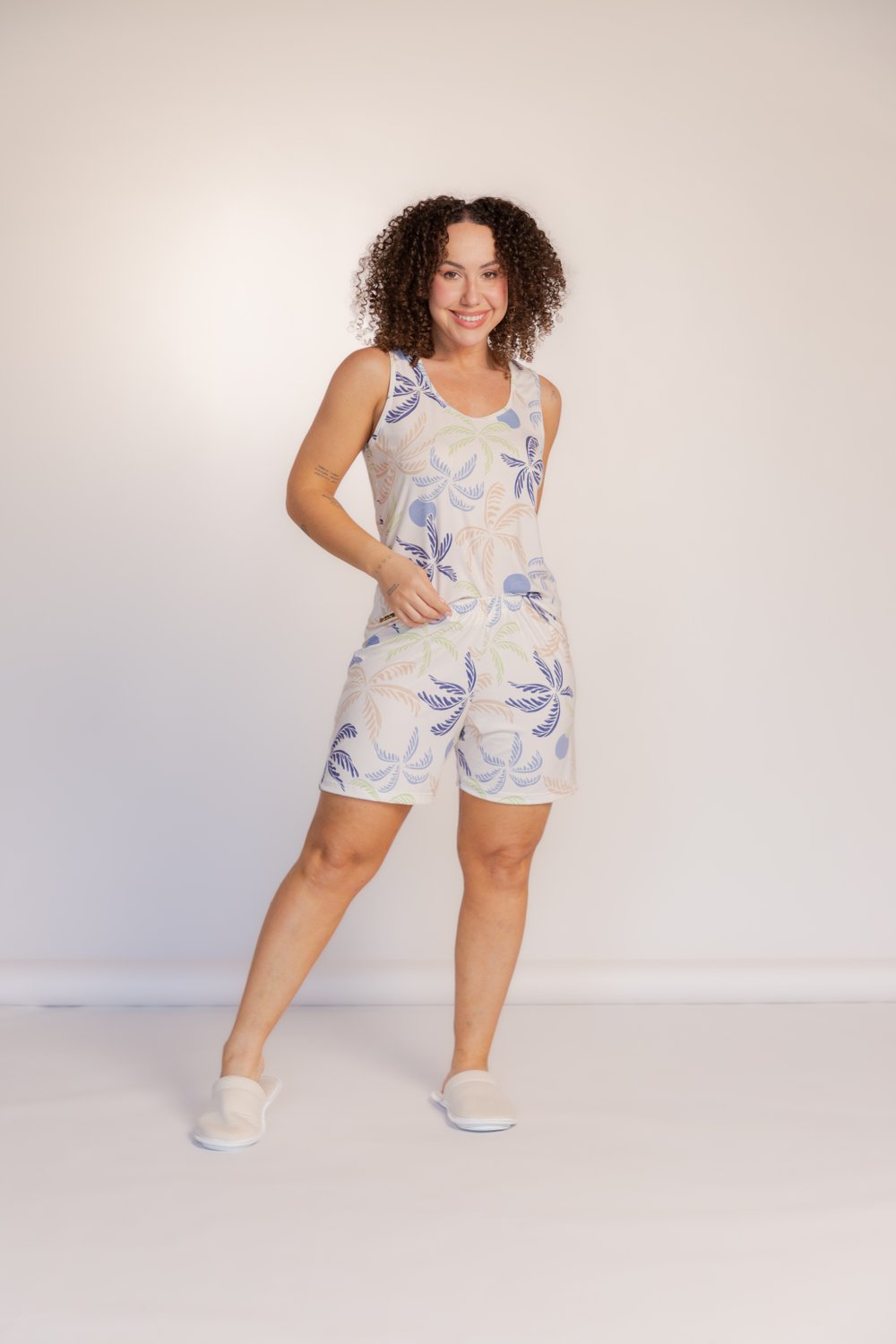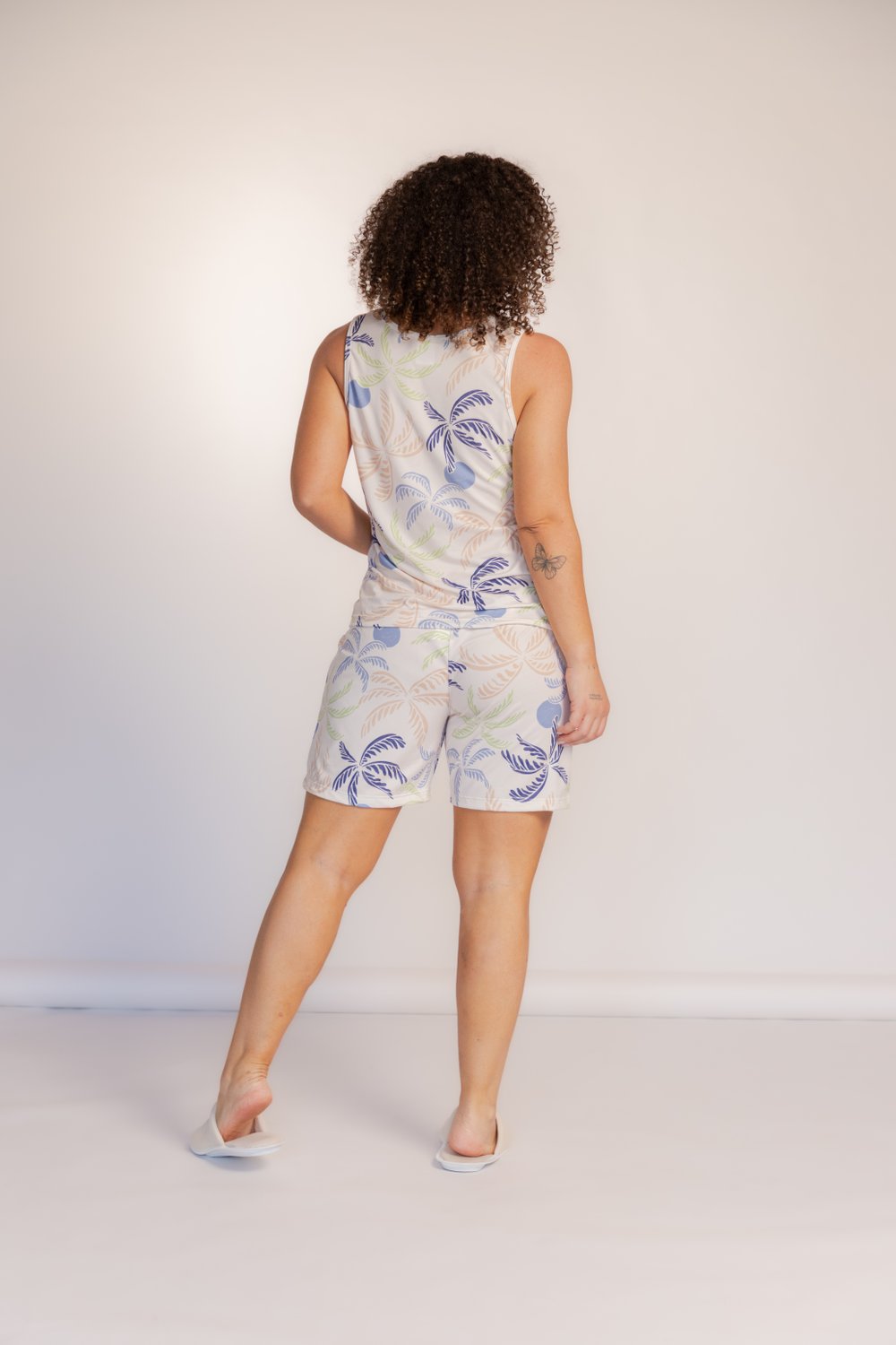 Frescor total para dormir e ficar em casa. Conjunto todo estampado em folhas em tons suaves (azul, verde e nude) sobre fundo claro, trazendo um visual leve e moderno. A parte de cima é regata cavada, confortável e soltinha; a parte de baixo é bermudinha com elástico na cintura e comprimento um pouco maior que o short comum – perfeito para quem gosta de mais cobertura sem perder o conforto.