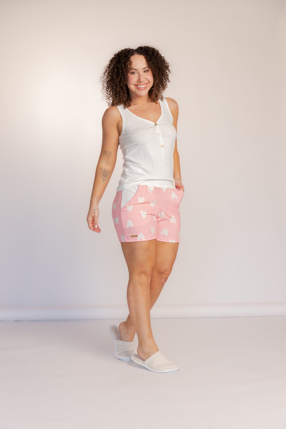 Bermuda Malha Dreams, composição 97% Poliéster e 3% Elastano.