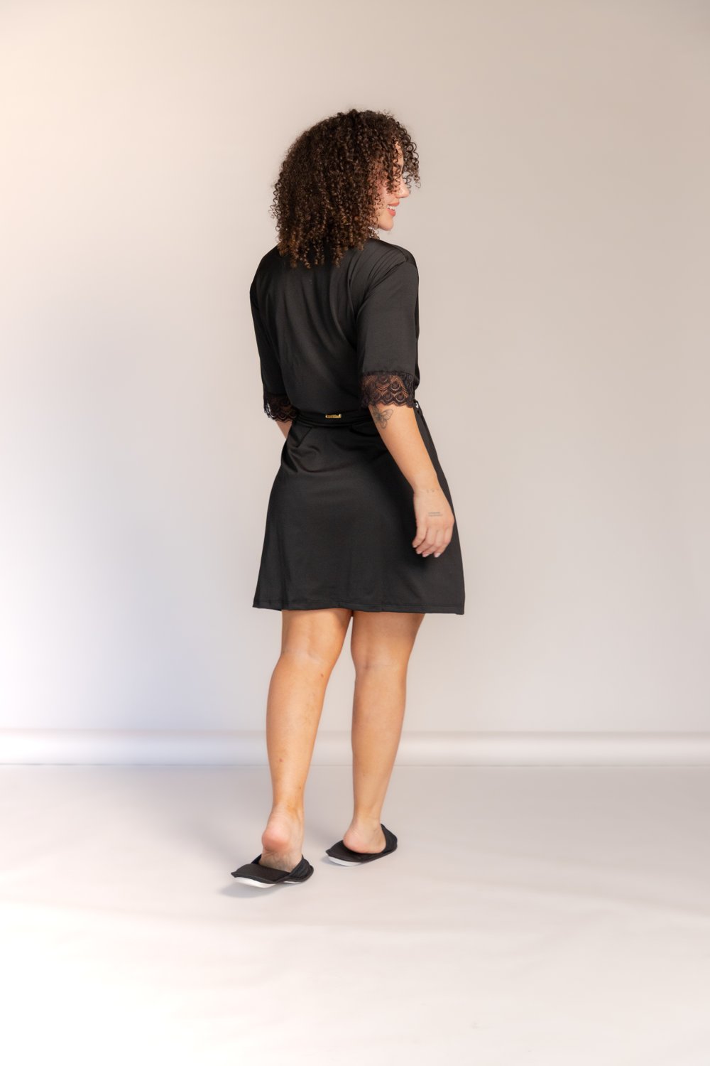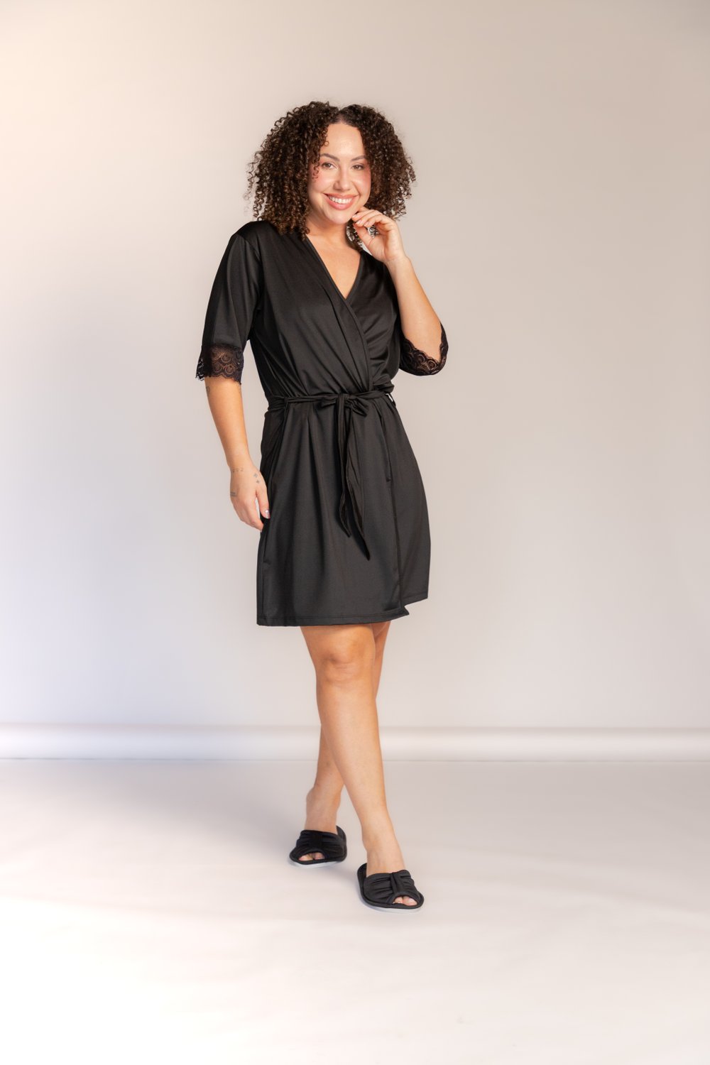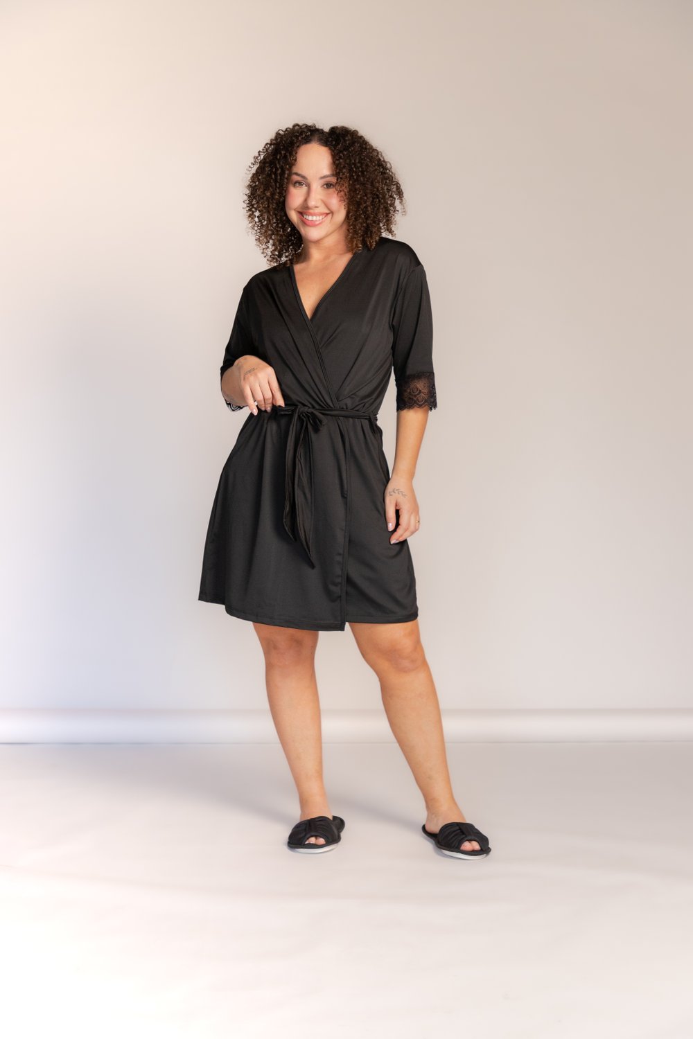 Robe manga 3/4 com renda, modelagem transpassada que valoriza o colo em “V” e amarração na cintura para ajustar como preferir. As mangas 3/4 recebem barrado em renda delicada, trazendo um toque sofisticado sem abrir mão do conforto. O caimento é fluido, a malha tem toque macio e caimento leve — perfeito para complementar seus pijamas ou usar como peça principal.