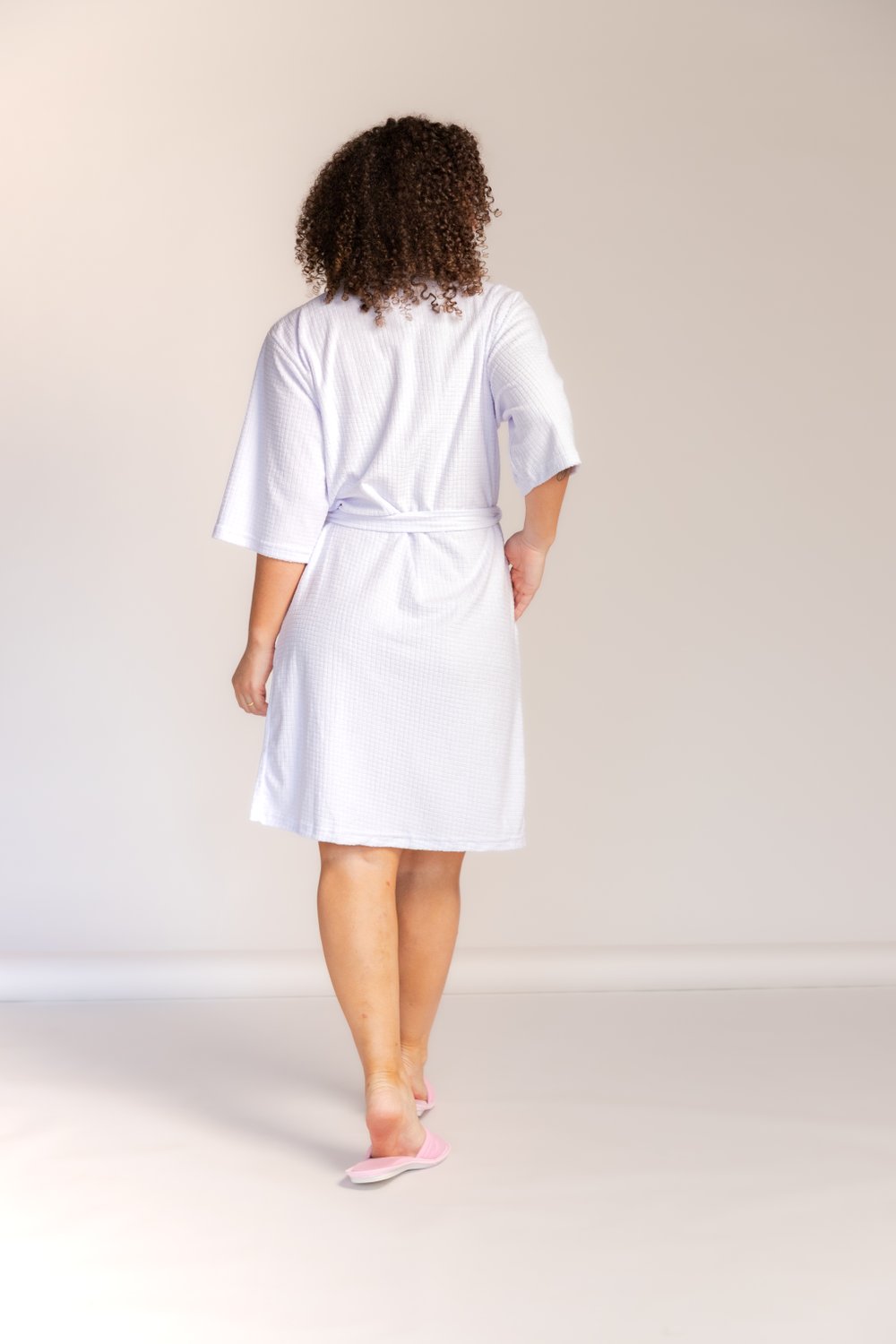 Roupão de felpa quadriculada com mangas curtas, bolsos e cinto para amarração frontal. Ótimo para usar no pós banho e piscina, confortável para usar em casa. Tamanhos P/M/G/GG.